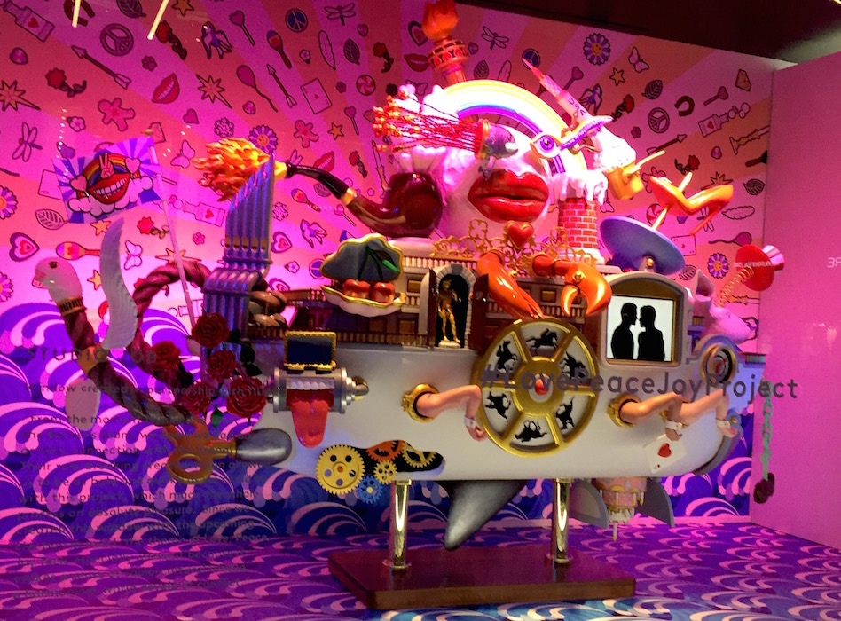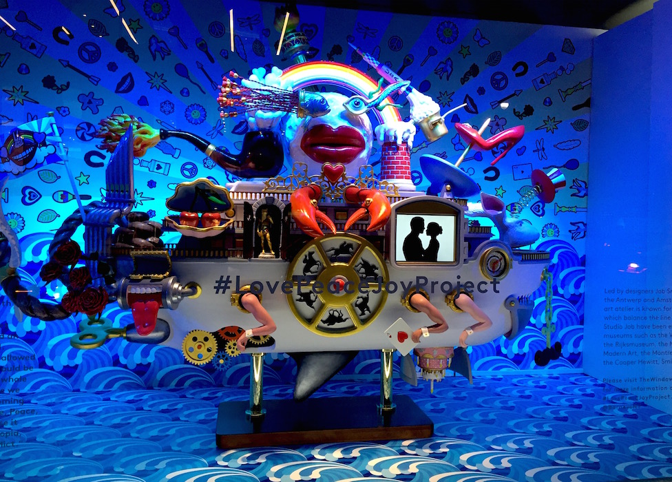 The psychedelic windows with a message of Art x Love x Peace x Joy is a perfect representation of this great city of creatives. The Madison store had a series of works by Nick Cave, Studio Job, and Rob Pruitt to go with the Trey Parker and Matt Stone from South Park window. The downtown BarneysNY had works by We are Prism featuring Honnda and Ebony G. Patterson.