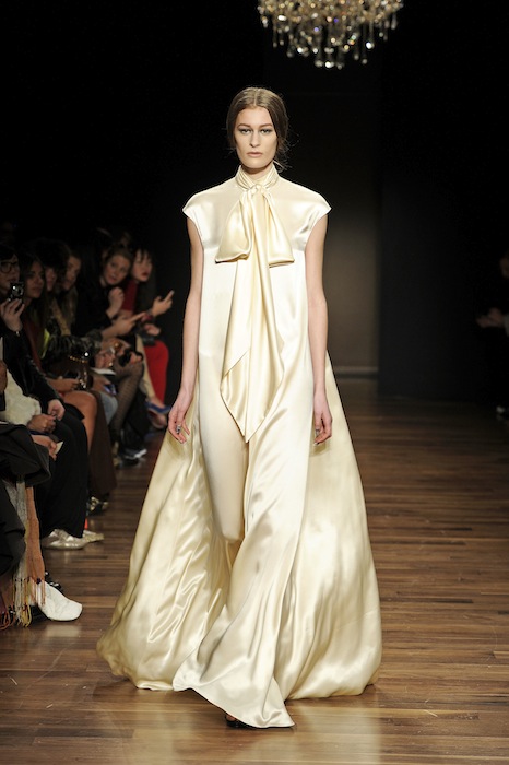 Houghton showcased jewel tones with accents of fuchsia, green and cobalt blue. All the pieces in the collection were exquisite, the (stunning) laminated lace, burnout velvets, and the waxed twill included. The the CHIC cool light toned floor length gown with oversized bow around the neck was one of our favorites. The fuschia lace cocktail number worn by Cody Young was hot for a clean cut modern look.