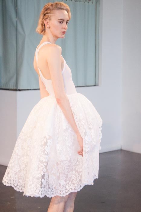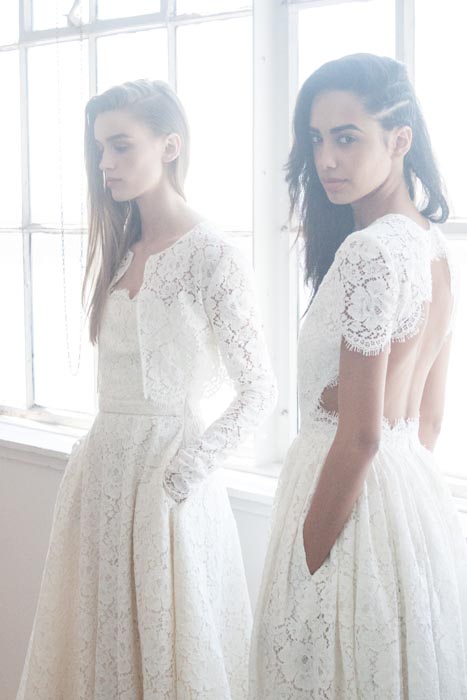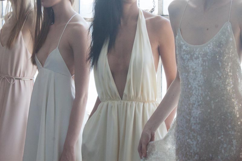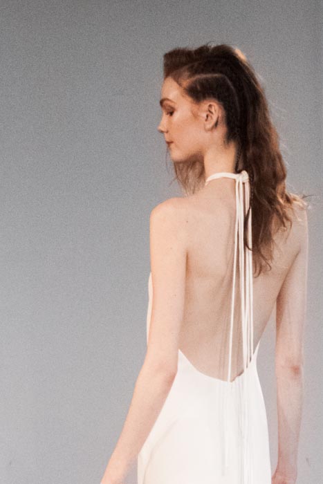A modern view of bridal at HOUGHTON spring 2015 from up and coming designer Katharine Polk. Not your traditional fluffy bride, this collection has a fresh perspective for the special day. Inspired by 90’s style icons Kate Moss and Claudia Schiffer, the collection fuses a young attitude with beautiful fabrications in body conscious silhouettes.