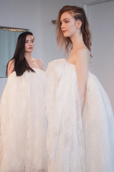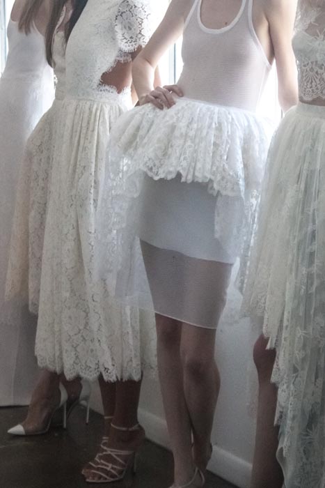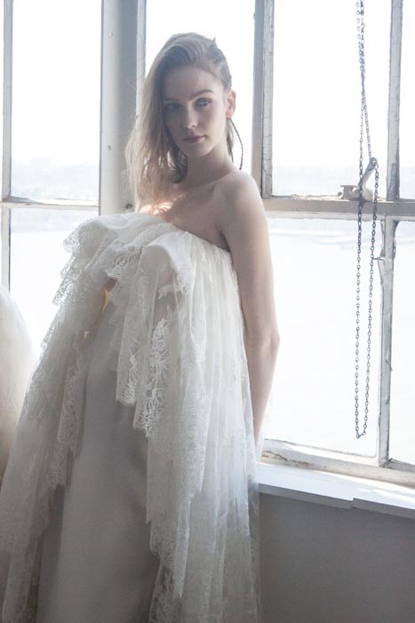 Twists on the “special day” tradition include sequined pants with a silk georgette blouse, spaghetti straps in body conscious silhouettes, a column gown with a chantilly lace ruffled cape. Favorites include a short dress of white mesh with a hand painted french lace peplum, and a high low full Chantilly Lace gown over layers of gazar. Here’s an exclusive view of FashionDailyMag favorites captured by Janez Jeretic at the Houghton Bride Spring 2015 presentation.