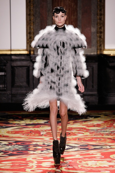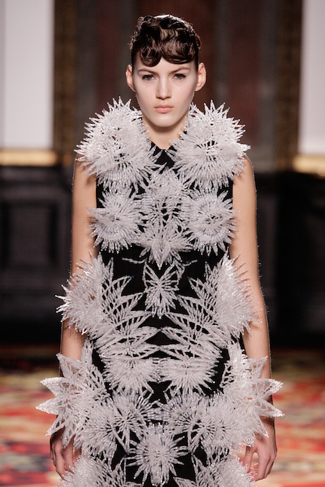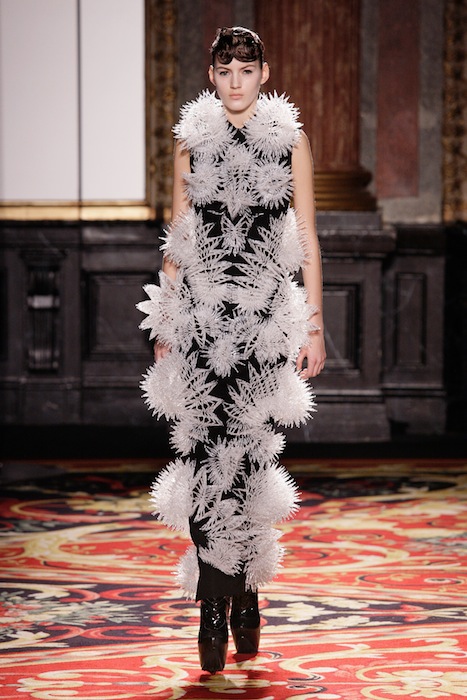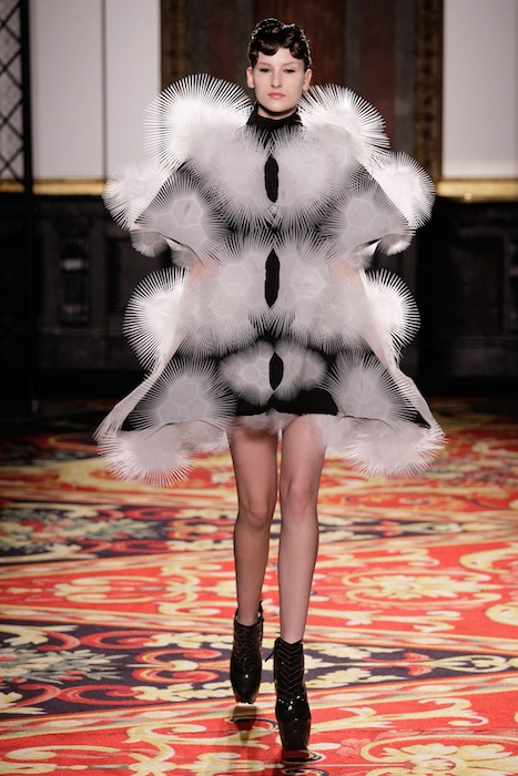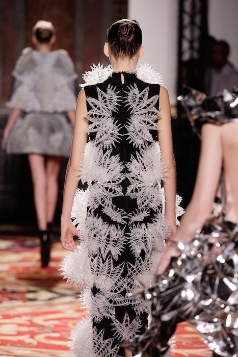 There is no doubt that energy was stirring around the room during the show, from the audience to actual electric lighting firing from the metallic figure; Van Herpen’s Couture 2013 collection has come to life. The designer had put together a series of 11 invigorating ensembles sticking to a black-and-white spectrum, with clashes of charcoal in between. All the pieces created had taken on an innovative role, related only though theme. A handful of dresses were perforated as if they had been embarked with thousands of volts, each following a distinct perforation pattern, giving the dress a uniquely distinguishable personality. The 3-dimmentional apertures followed what looked like a robotic skeletal pattern geometrically carved into the fabric. Two of the dresses were especially discernable as they were blanketed with ion-like crystals diffusing outward in an explosive manner as if they had been struck by lighting resembling the white plume-like seeds nesting on a dandelion.
