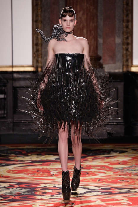 A magnetic field seemed to pull the filaments of two other gowns outward flourishing like a mechanic flower, about to expose the contents in its core; one of the looks was dressed with a metallic creature that enveloped the models neck, situating itself as a collared accessory. One of the garments had been attributed with black veins that cascaded though the carefully weaved fibers while another was tightly embellished with onyx tipped white conoid appliques that covered every centimeter of the dress. The finale dress literally beamed light from its mirrored trapezic details, which had peaked outward in every direction and angle possible to allow light to be captured and reflect off of the dress throughout the entire room. Van Herpen’s magnificent collection had managed to stun every witness in its avenue: the time, creativity, artistic expression and attention to detail this collection had exhibited was what makes Haute Couture, Haute Couture. We can’t get enough of this collection, incroyable ! Iris Van Herpen spring 2013 haute couture paris fdmloves selects by Brigitte Segura, written by Julia Paulescu