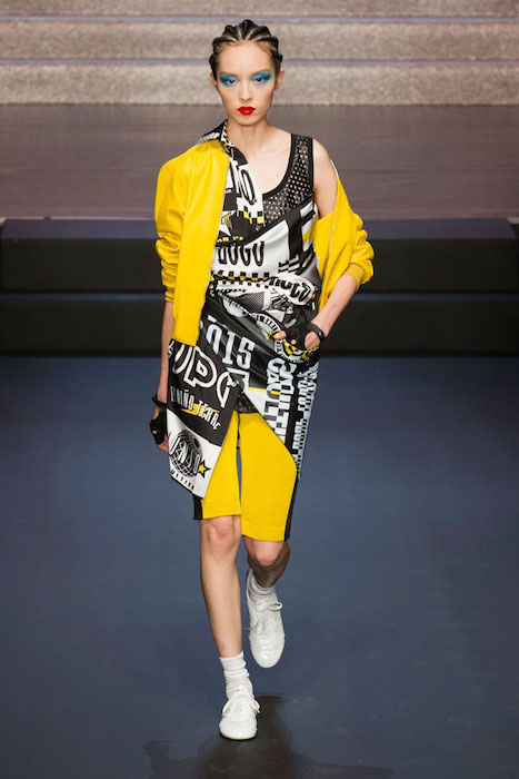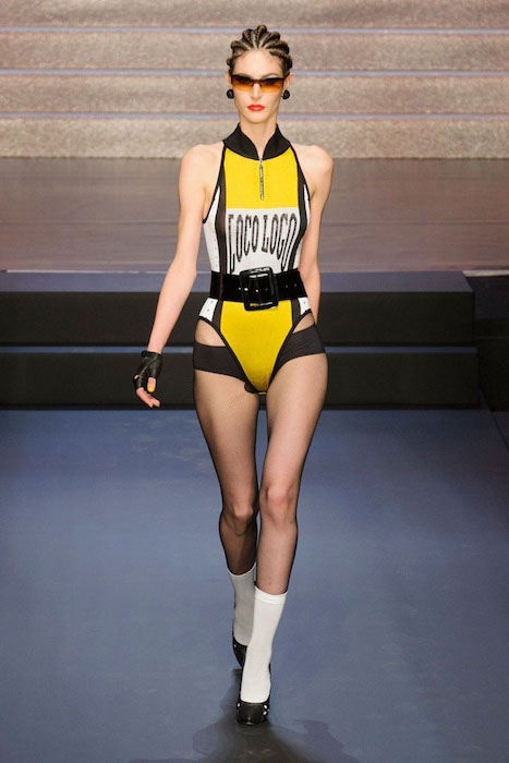In transition to the early nineties, this run presented heavily boxing sportswear-inspired dresses. Bold colors accented by black and white stripes are reminiscent of the sporting goods brand Everlast, which rose to popularity in the nineties in New York urban culture. Though the run that perhaps brought forth the most humor throughout the night’s extravaganza was the nod to Lucha Libre. A little ode to Mexican wrestling culture, ethnic patterns, skin tight pants in bright shiny colors wonderfully paraded down the runway with all the models sporting wrestling masks, making the walk that much more fun. Check out a live vid here of the finale shared by Anna Dello Russo.