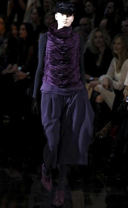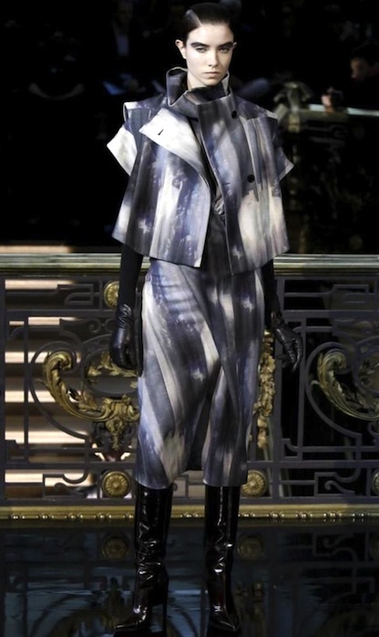 Simple and striking with hard lines and purposeful with distinct shaping – the silhouettes were sharp, but tastefully so. Seamed with finesse, and draped with a deliberate hand, the looks were modernly clean. Dresses with ruching down the center or at the side had a classic feel, while asymmetric volume at the hip made for artsy. Several pairs of wide legged cropped pants had a structured almost architectural composition as did T-shaped tops and cocoon-like sheaths. Textured elements, colorful printing, and sheer pleated paneling teased a tiddy-bit of playful. Styled with ankle boots, and caps on occasion, plus bizarrely painted on eyebrows, together with the fashions they captured the moodiness of the vision. fdmloves selects from JOHN GALLIANO aw13 by Brigitte Segura, written by Sarah A. Freiseis.