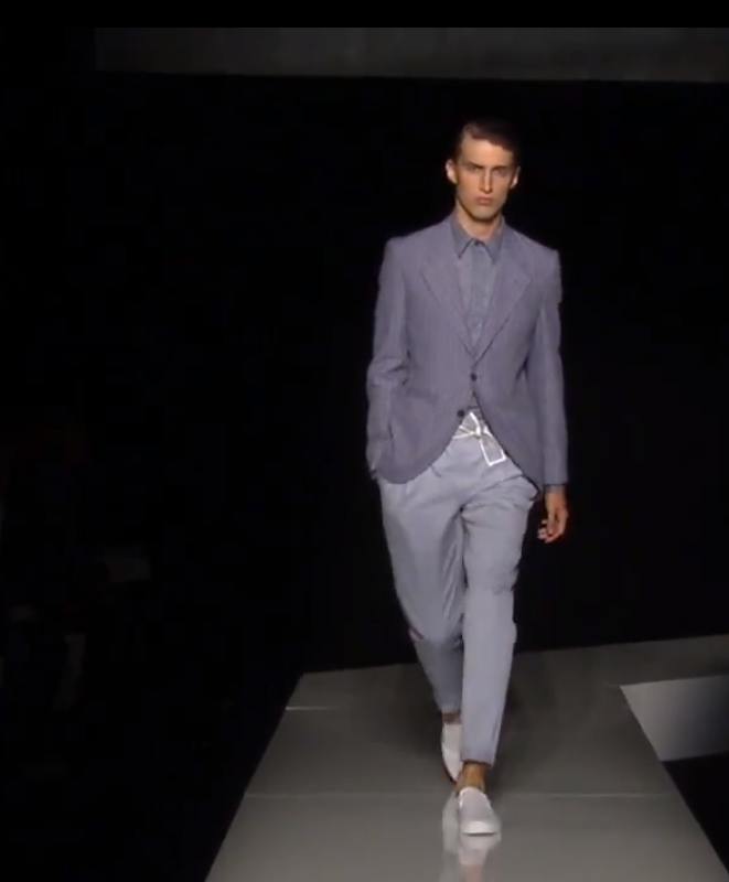 Greys, blues, and ruby red hues gave posed proper with lively pieces thrown in to keep it from being stuffy. Herringbones and thin-lined plaids worked well when appropriately stacked with patterned dress shirts or against solids, especially trousers. Utilitarian cuts turned chic with belted flair, motorcycle styles were more refined in light shades such as cream, and rainy day outerwear was enhanced with weatherproof shine. Leisure time styles like bold stripes, just above the ankle length pant hems, shorts paired with sweaters, and the presence of fresh whites gave a nod to Americana while leaving the office at bay. Suavely gelled hair, deck shoes, and a silky scarf infused casual elements while the remaining sharply dressed.