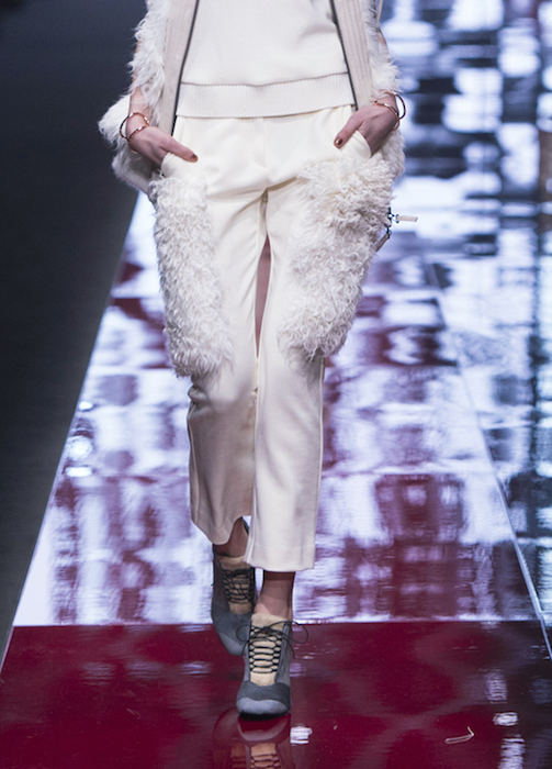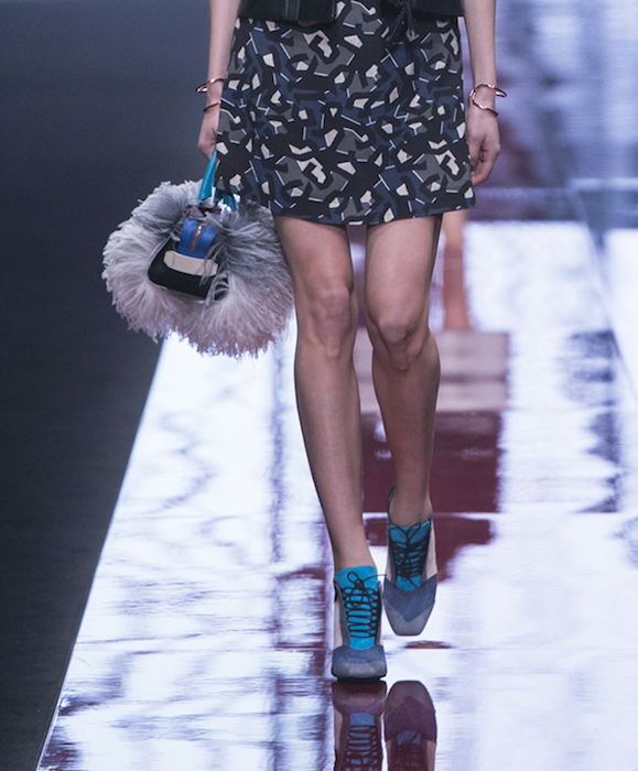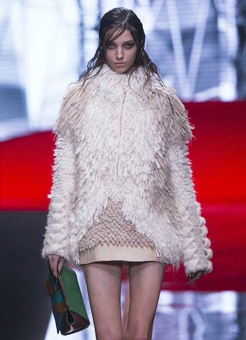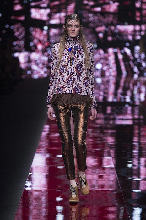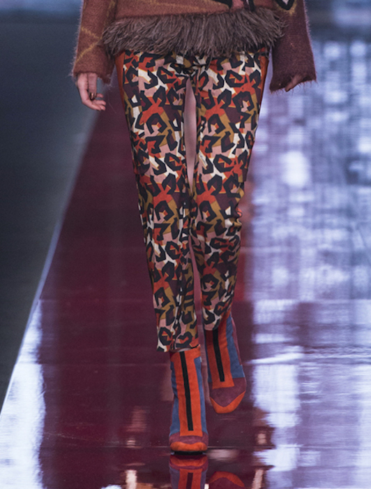 Untreated wools with a pavé of micro-studs and jacquard with coppered plaques are lit up by lurex and optical-art. Textured brocades with Bauhaus vibe fuse with fading feathers in lightweight patterns and embroideries. Warm shades such as rust, mustard and deep blood red add depth to the lines. We’re loving Architectural design inspiration in colorblocked suede ankle boots. JUST CAVALLI fall 2015 MFW commentary + runway selects by Brigitte Segura.