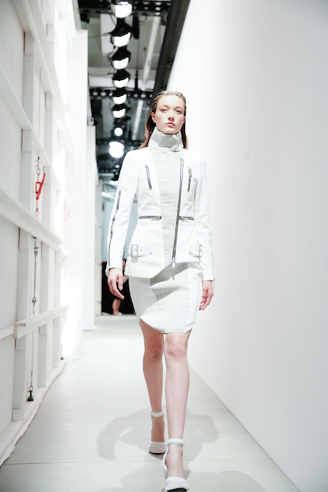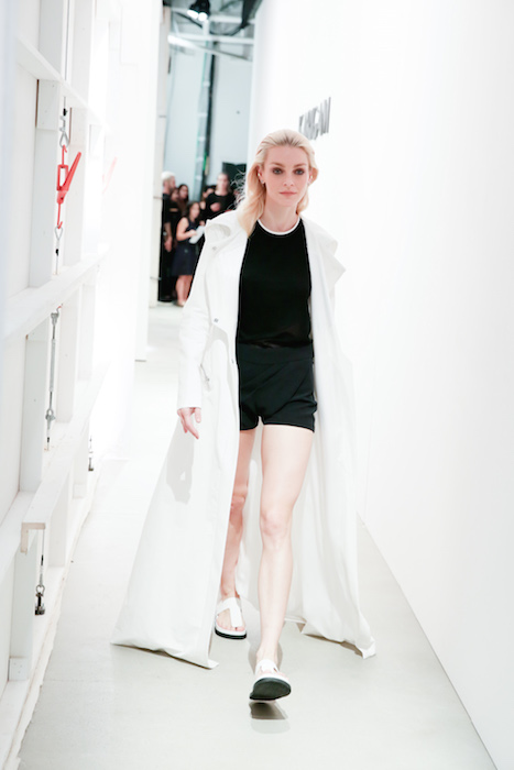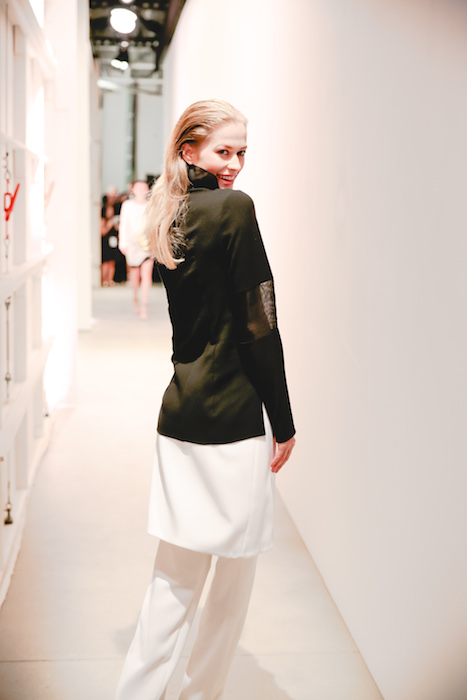 The collection featured a minimal palette of monochrome hues of white paired with nude, black, and gray. Emphasis was on color blocked neutrals, layered textures, and zipper detailing—each piece possessing a unique, elevated element.