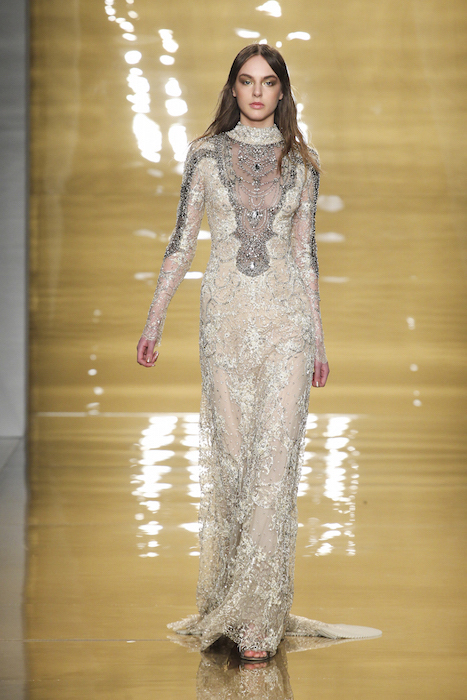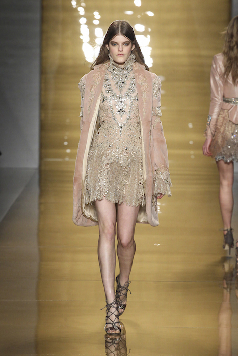 Reem Acra included a chock full of lace designs maintaining a strong preference towards black and winter neutrals, while Roberto Cavalli and Balmain showcased striking variations in sea blue, tangerine, and violet. Neutral lights predominantly appeared in luxe cream and champagne lights, far from “wedding gown” whites with a more sophisticated presentation. LACE for fall 2015 written by Christine Buzan.