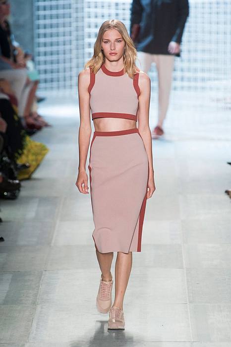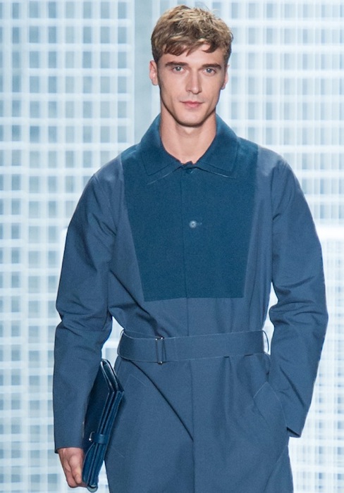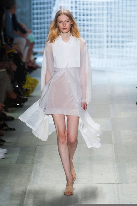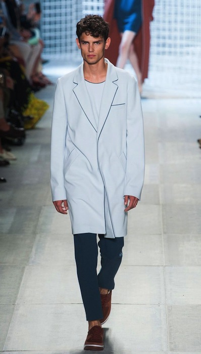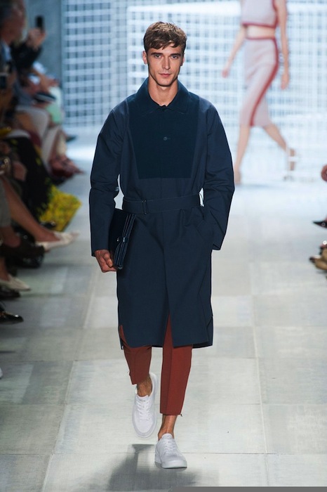 White-on-white looks continued the transparency theme, including a sheer jacket paired with a tank mini dress and a tailored blazer teamed with a pair of cropped pencil trousers. The clever use of architectural seaming was enhanced by the breezy, earthy color palette, which centered on tennis whites, dusty pinks, faded blues, and deep greens. A standout look was a woman’s airy trench coat in an earthen hue thrown over a light pink shift dress, complete with a bold baseball cap to provide the signature sporty twist. fdmLOVES LACOSTE SPRING 2014 selects by Brigitte Segura, written by Khia Mercer.