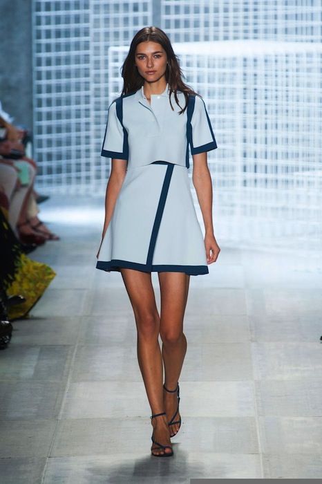 The designer’s clever use of white piping and smart tailoring made the pieces better suited to an afternoon perfecting your backhand volley. The graphic white lines of the tennis court were also featured as the piping on the border of dresses and men’s jackets, barely-there jersey-striped paneling was featured on cropped tops and rugby dresses. Familiar faces on the runway included Julia Nobis, Arthur Gosse, and Clement Chabernaud.