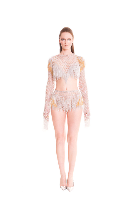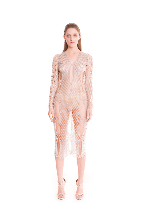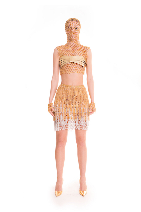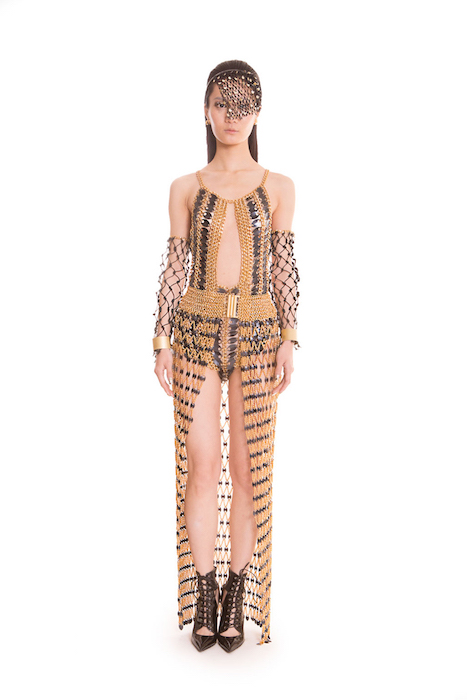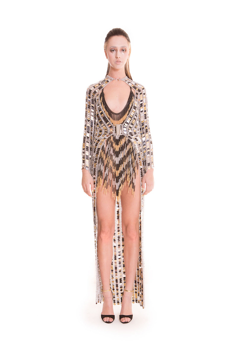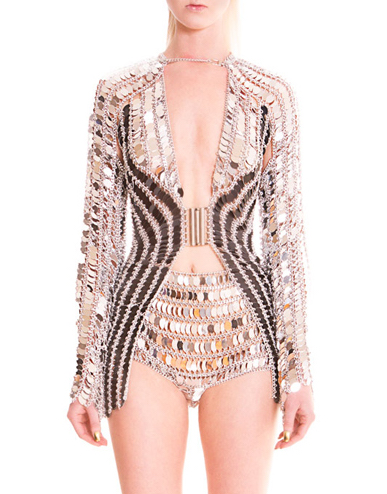 Fall 2015 collection revealed the evolution of chainmail to a more finessed crafting. Hand woven metal mixed with paillettes are the lighter more luxurious application.