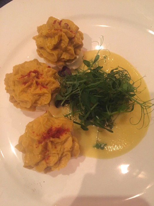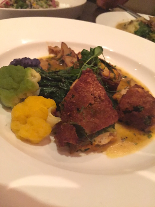 The feast to arrive was no joke. Starting with the appetizers, I got the empanadas, with brussels sprouts and fennel topped with guacamole – YUMM. Lau’s selection was deviled tofu. Not my flavor, but the texture and look of the faux deviled eggs was a definite WOW and Lau raved at how divine the dish was! By now, I had asked at least 3x about my rolls… “are you sure this is gluten free?” Yass!