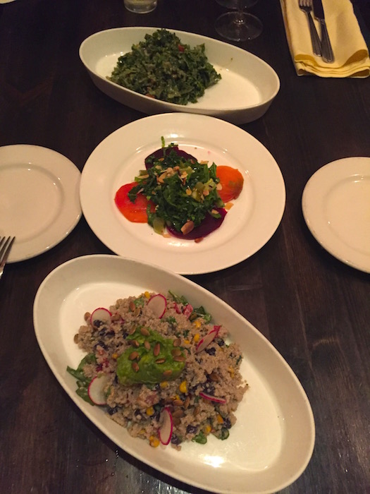 Next came a little trio of salads: Quinoa, Kale, and Beet. The quinoa mix was just perfect. Abundant flavor with a little tang, moist enough, and flavor rich with veggies without an overdose of bell peppers – YUM! The trendy kale salad salad choice was a different sort of delicious, tossed in a creamy tahini dressing that fused well with the not too crunchy kale. The third salad was a beet carpaccio that balanced the other two heavier meal-like salads. Nice. Hungry yet?