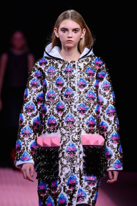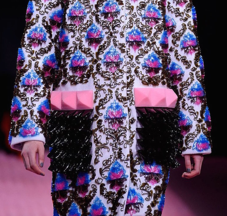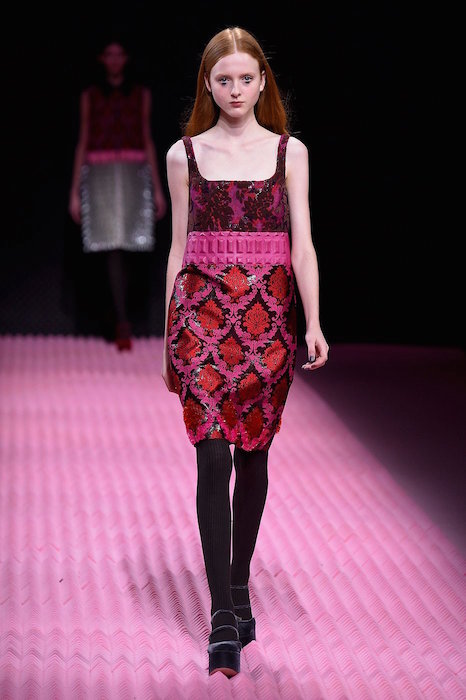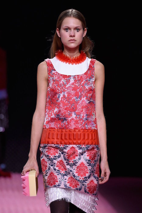walking the shine on pink! MARY KATRANTZOU gives us embellished feminine looks with plenty of pinks + reds swirled with texturized bling. What a princess dreams of wearing for daytime flash appeal.