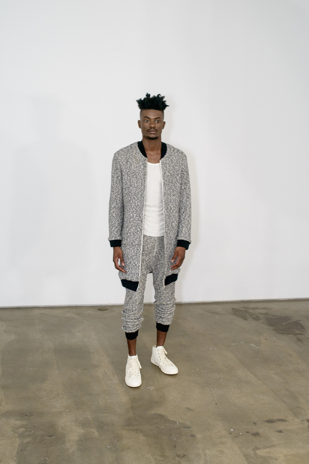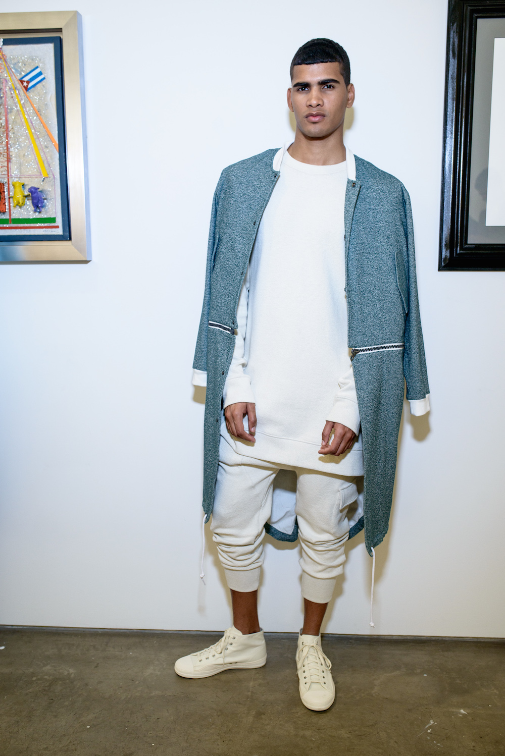 A light aesthetic of white on white jogger sets; cropped pants and tweed raw edge blazers show off the meticulous attention to detail dedicated to each garment. Reinvented double breasted overcoats featured sporty combinations of baseball + bomber jacket designs and zippered pockets. Accompanying all of the looks were comfortable, white, canvas sneakers by Tretorn, shows the diversity of the garments. The modernistic approach of Loris Diran effortlessly reflects the timeless demeanor of a classic fashion powerhouse with a twist of bespoke detailing.