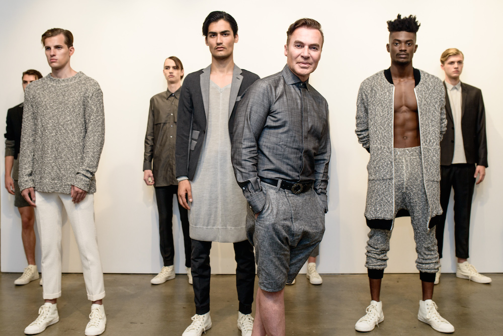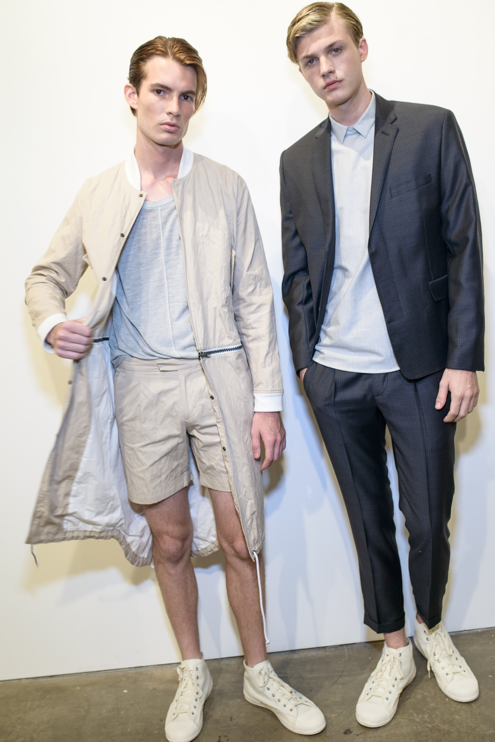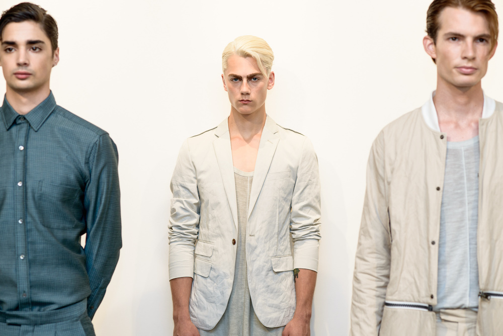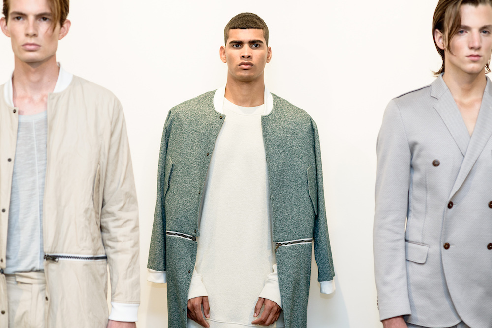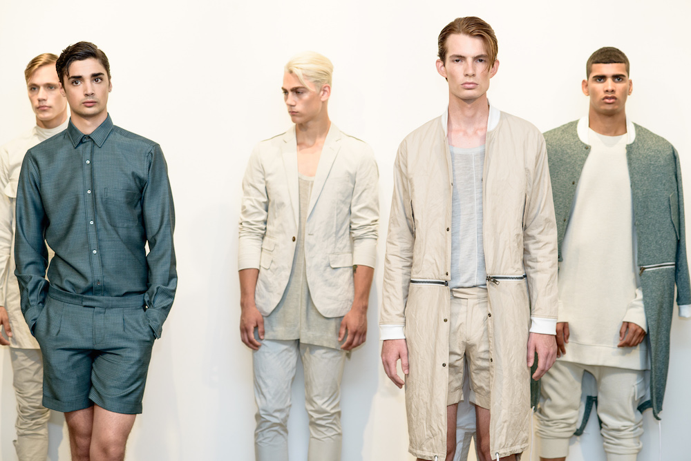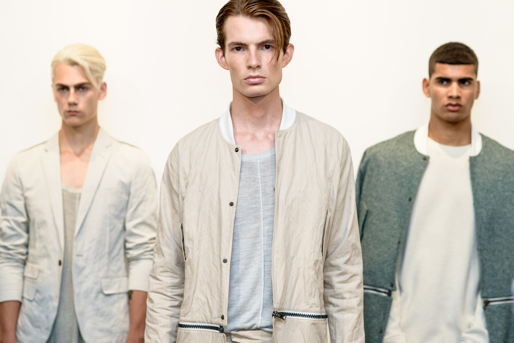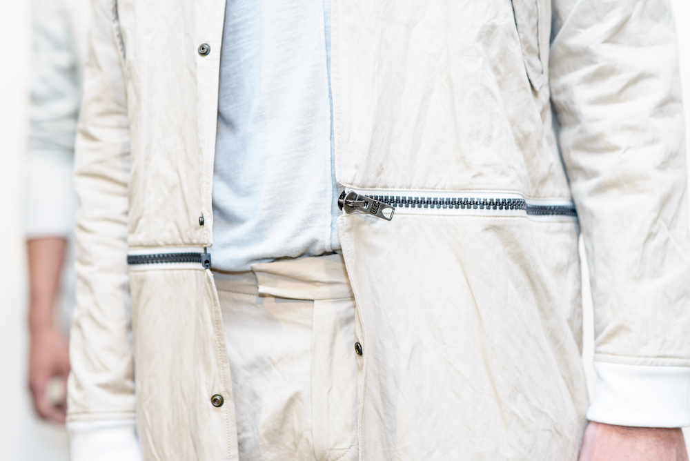 Menswear: Softened pales at Loris Diran for SS17. The Chic parade of neutrals and unique fabric pairings were the focus for Diran’s somewhat unconventional twist of streetwear x sportswear, shown during NYFWM. Calling his pales “sunbleached colors and green foliage,” the young designer with uber tailoring expertise brings artistic flavor to CHIC menswear.