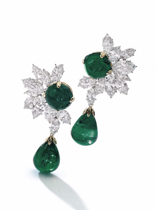 Formerly in the collection of Princess Salimah Aga Khan Emerald and diamond earrings, Harry Winston The emeralds weighing respectively 11.33, 11.94, 21.64 and 22.29 carats Estimate CHF $1,500,000 – 2,500,000 / $1,500,000 – 2,500,000.
