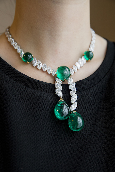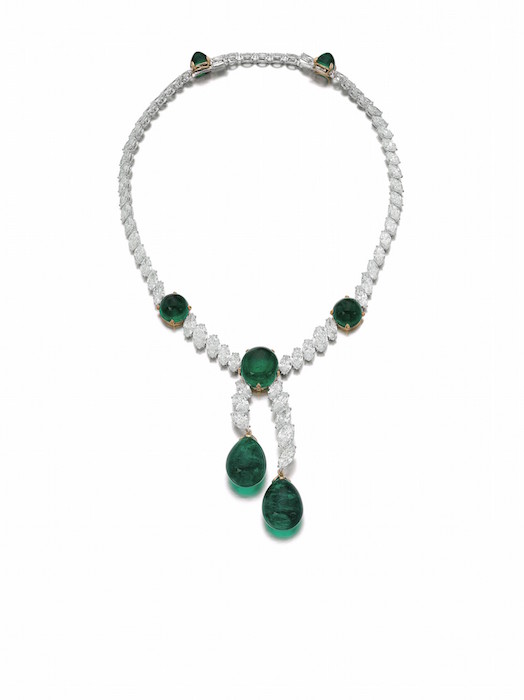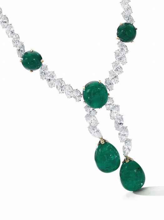 Formerly in the collection of Princess Salimah Aga Khan An Emerald and diamond necklace, Cartier The emeralds weighing respectively 4.34, 4.69, 14.56, 14.65, 28.76, 50.65 and 51.32 carats Estimate CHF 3,500,000 – 4,500,000 / $3,500,000 – 4,500,000.