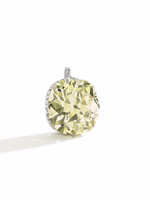 A Fancy Yellow diamond pendant The old mine brilliant-cut diamond weighing 51.15 carats Estimate CHF 600,000 – 1,000,000 / $ 600,000 – 1,000,000.