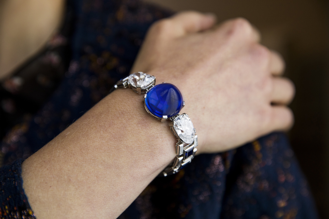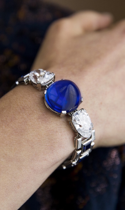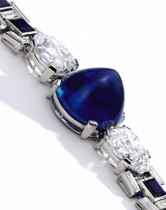 Property from an Important Asian American Collection A Sapphire and diamond bracelet, Cartier, 1927 Set with a Burmese cabochon sapphire weighing 46.07 carats, Flanked by two pear-shaped D Colour diamonds weighing 8.60 and 9.27 carats respectively Estimate CHF 2,000,000 – 3,000,000 / $ 2,000,000 – 3,000,000.