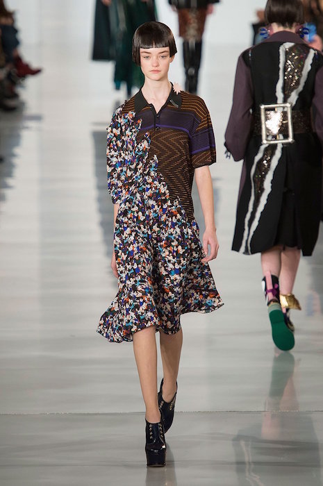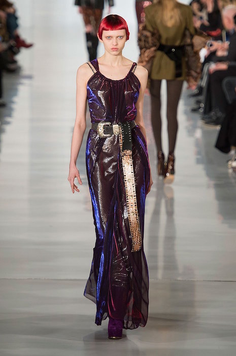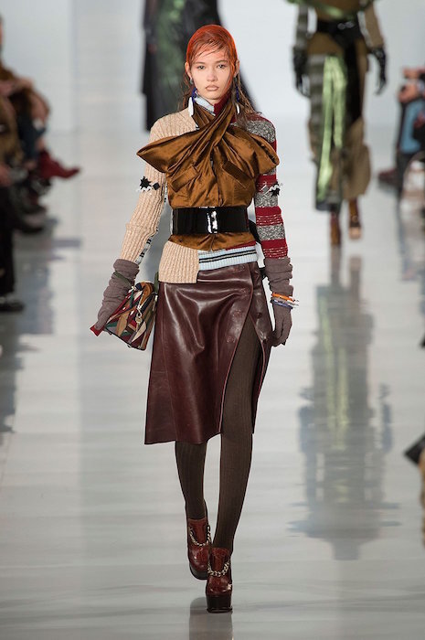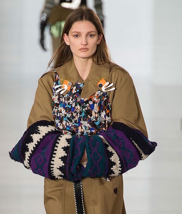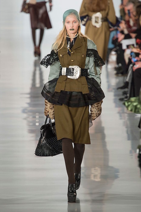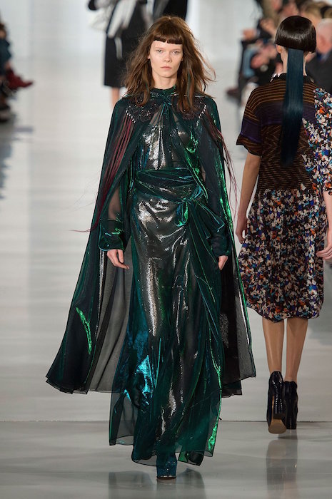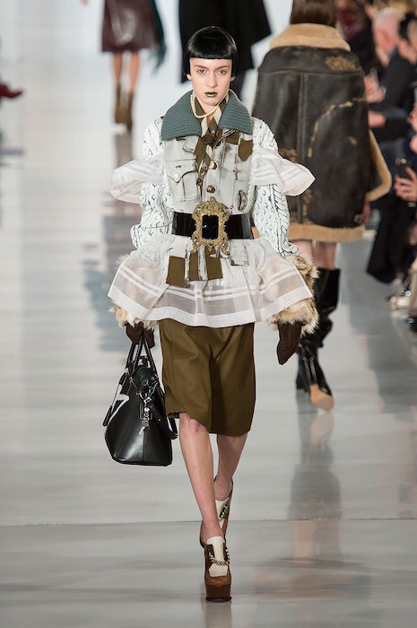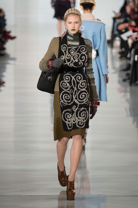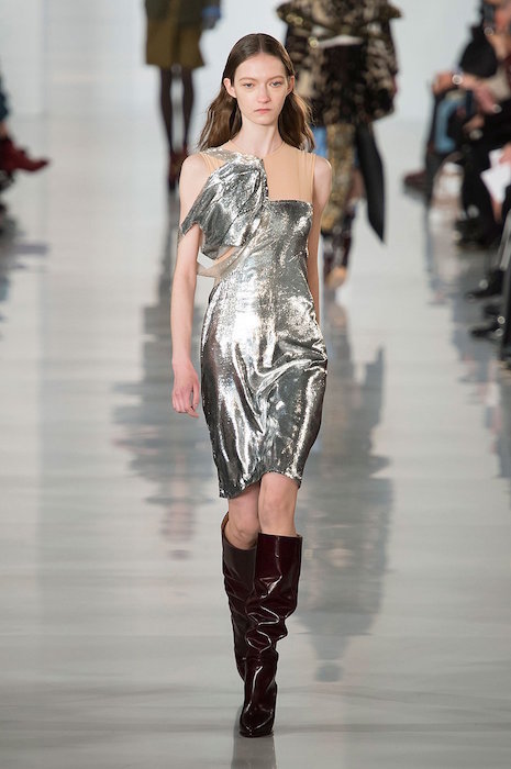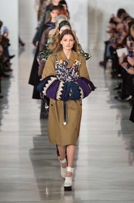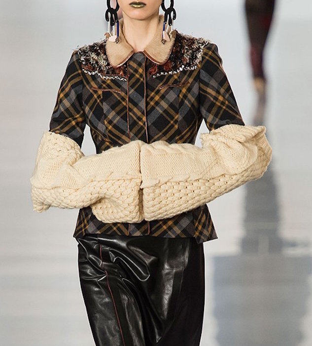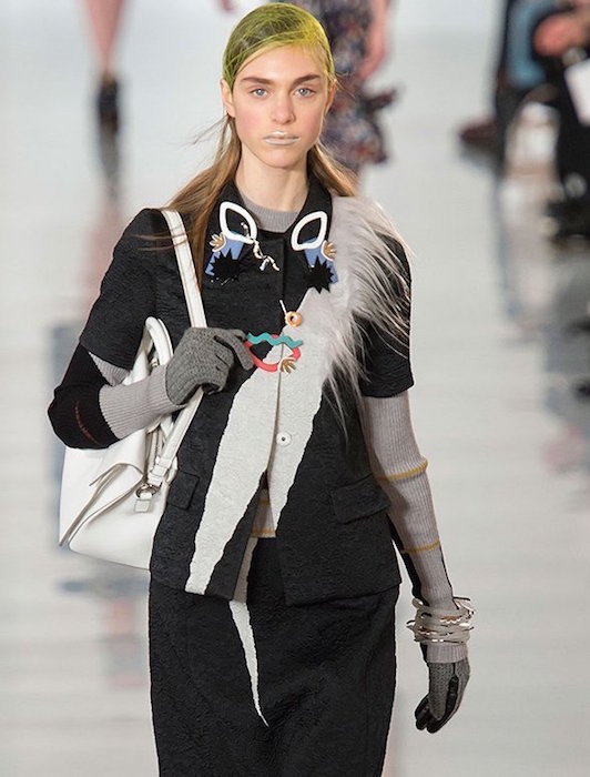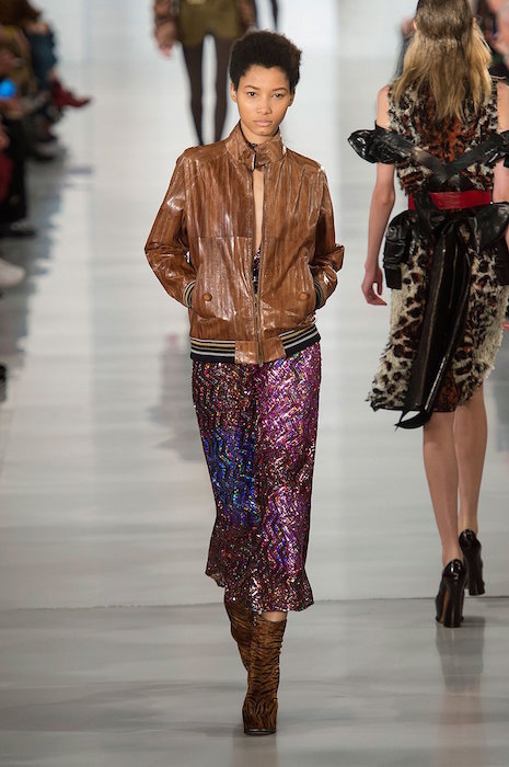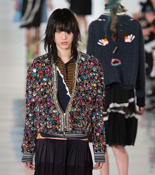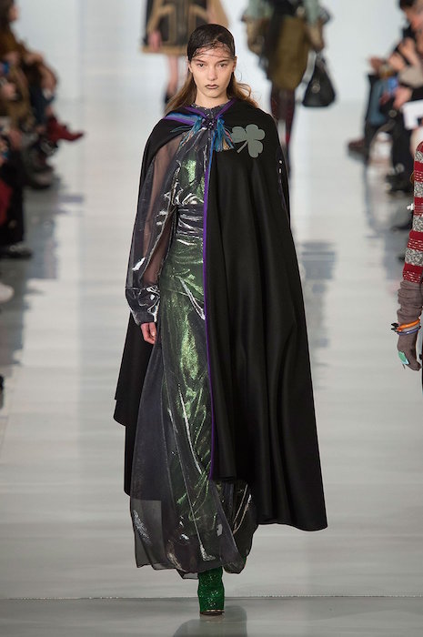 Aah, the multi-layered boldness on the Maison Margiela runway for fall 2016. Shown during Paris Fashion Week, a romantic flavor meets a hint of oversized drama with Margiela modern comfort. A hint of luminous confetti shine peeks through here and there, with a jeweled baseball jacket grabbing a little extra bling attention.