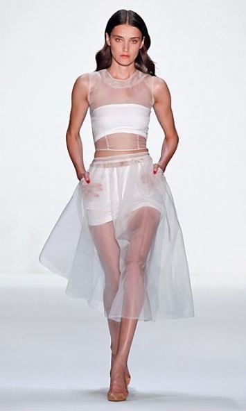 A display of airy, femininity was present in the Malaikaraiss spring 2014 ready to wear collection in Berlin. The runway was in abundance in pretty, pastel and translucent aesthetics. Known for its fun and feminine clothes, this season Malaikaraiss showed some high-low hemlines and peek-a-boo cutouts giving a whimsical play remaining sophisticated.