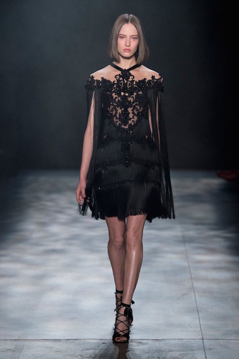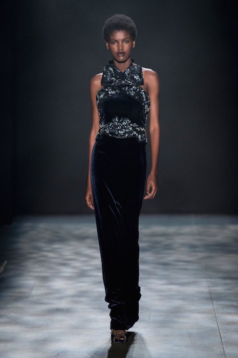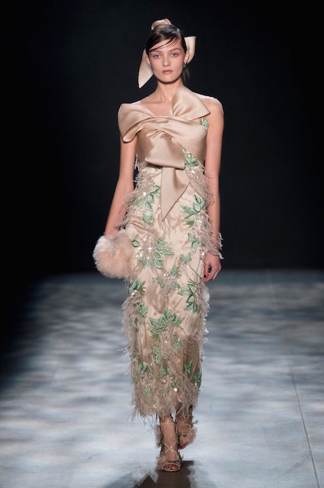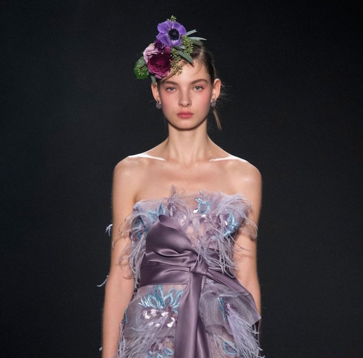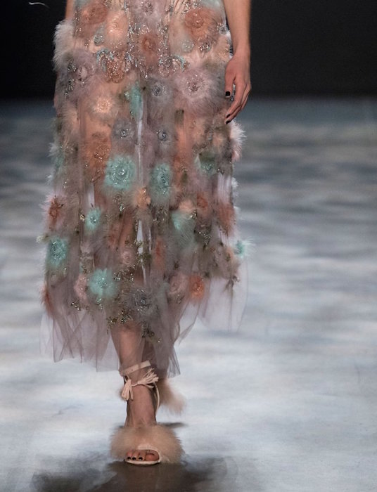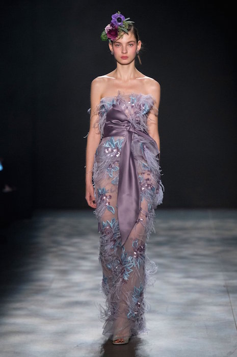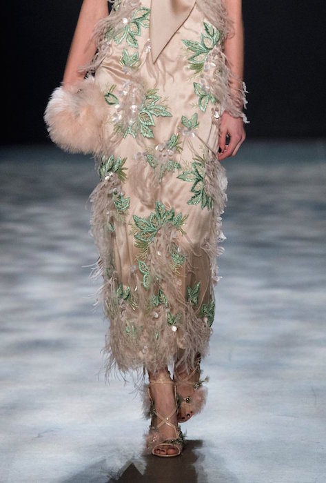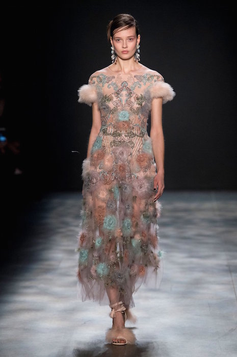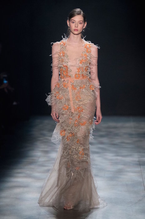 Romance is always in season, and Marchesa is all about it for fall 2017. Feathery gowns in dusty tones, and hints of a pale rainbow make their way in tassel details.
