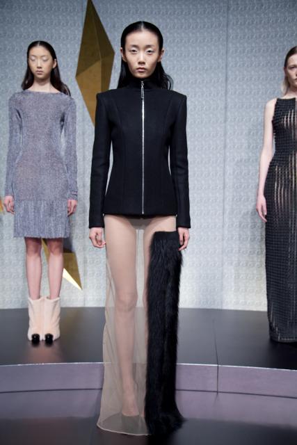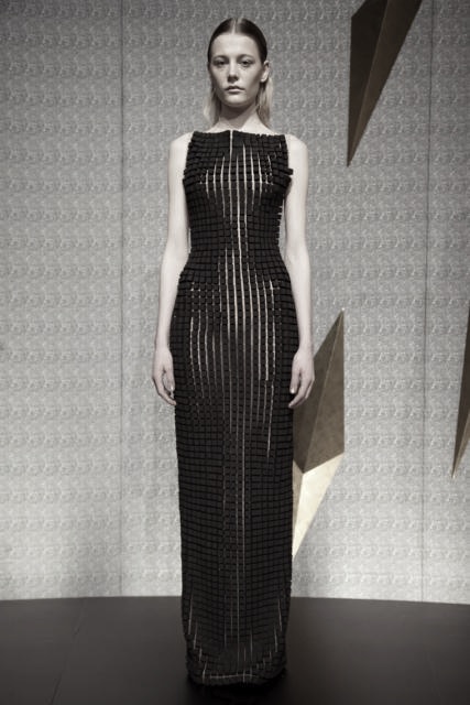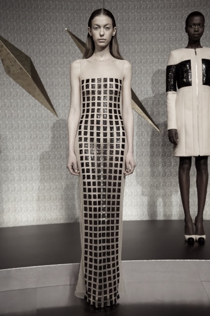 His pieces were contained in simple cuts, with much of the detail concentrated on modernized textures and shapes. The non-dramatized hair and make-up really kept us focused on the pieces. An ultramodern evening wear vibe included gowns embroidered with black squares and knit dresses with metallic grids.
