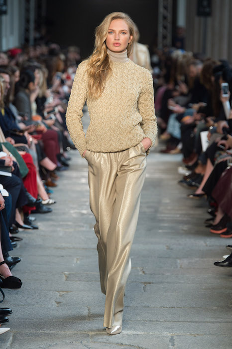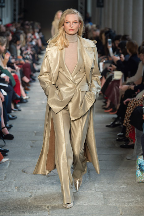 RED HOT + GOLD surprise. Highlights from MAXMARA fall 2017 collection featuring GiGi Hadid, Lily Donaldson, and a parade of elegant understaded shapes on the Milan catwalk. The 70’s Lauren Hutton -esque liquid gold on gold jacket, pants and trench is my absolute favorite look with chunky knit + gold combos next on the faves list.