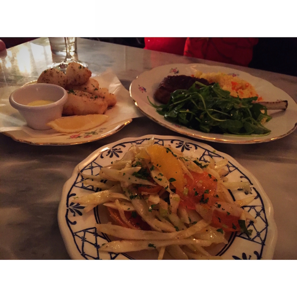 The mini dishes range from seafood to chacuterie + vegetables, with vintage + unmatched tableware adding to the rustic atmosphere. I tried the amaze fries (of course), called Patatas Bravas with spicy homemade sauced with roasted garlic aioli on top. Then some mushrooms, and specials including a wow fish and a fennel + persimon salad.
