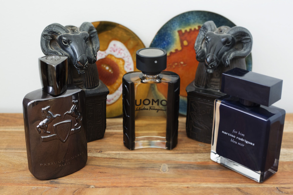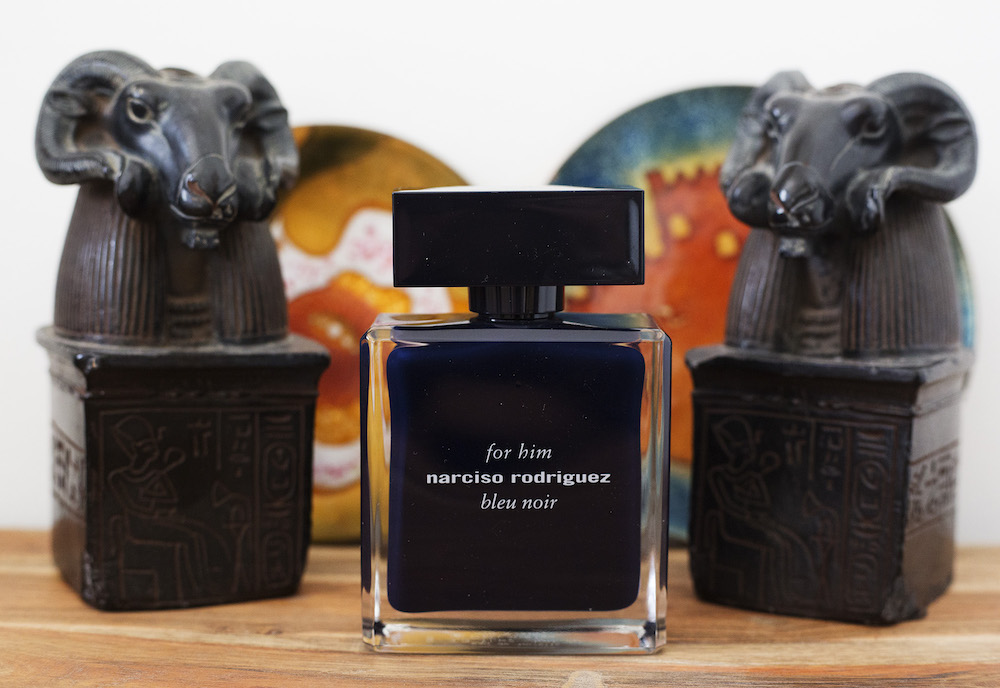 NARCISO RODRIGUEZ Bleu Noir for him “A sensual trail”. And another woody and musky fragrance, this time with cardamom and nutmeg, hints of blue cedar, black vetiver, and ebony wood. Sensual and borrow-able, yes. at Sephora.