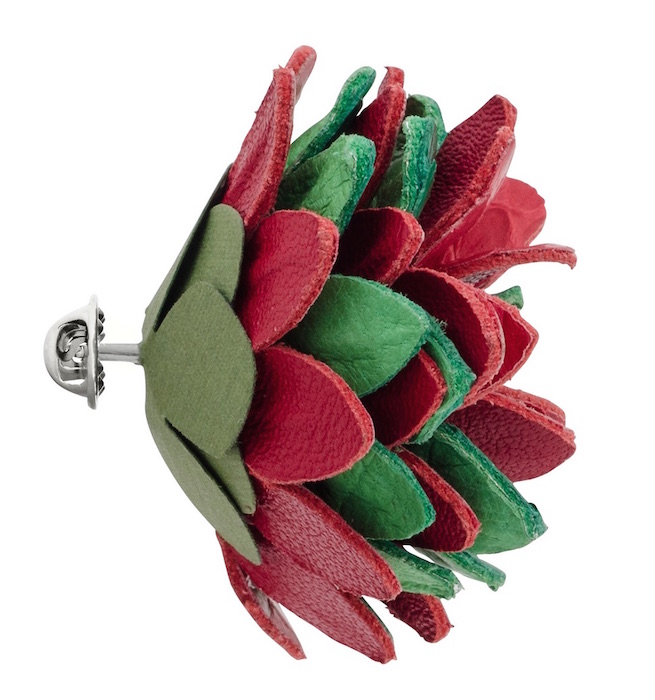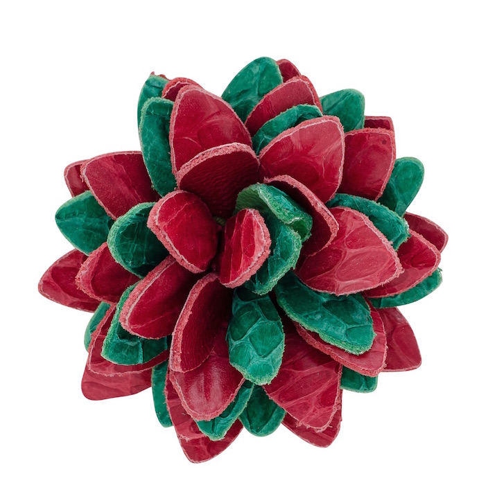 The finishing touch: Whether you’re all dressed up or just need a little holiday cheer, the Holiday Python Dahlia pin by Fleur’d is the cutest add to wear or to gift. Handcrafted in NYC, with red x green python skins with DTM leather. Approximately 1.75” diameter + Handcrafted in New York City.[$200].