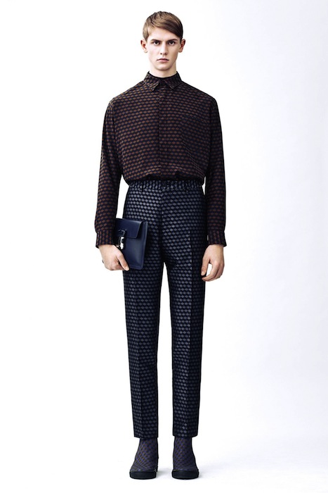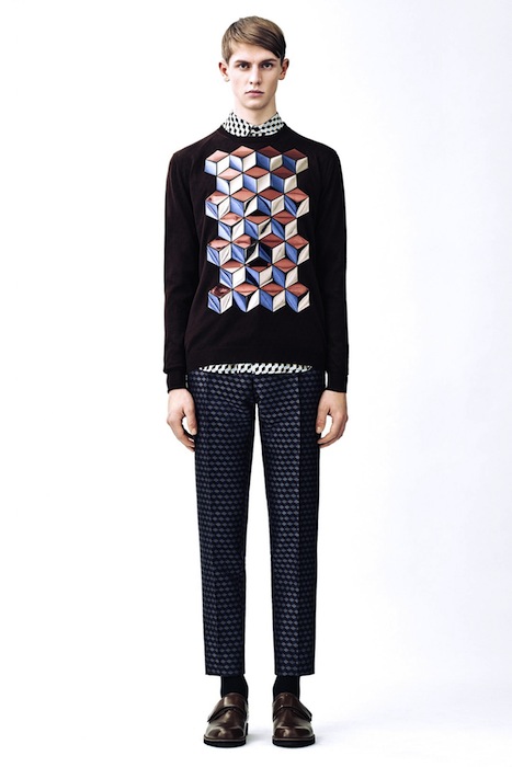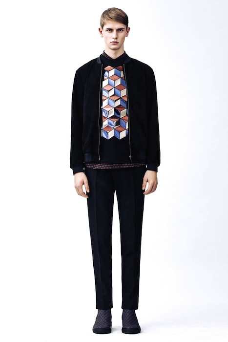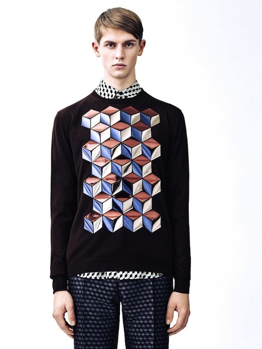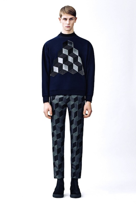 GEO KANE! for fall 2015 menswear, CHRISTOPHER KANE plays with patterns and textures with a geometric theme. Though not far from previous inspirations, this collection mixes play on graphics with a more grown up view. From bold CUBES on intarsia sweaters and pants to shiny graphic splashes and all over patterns on jackets… This collection has a modern, clean, and balanced point of view, though we missed the usual KANE graphic fun. Here are some of our favorites: