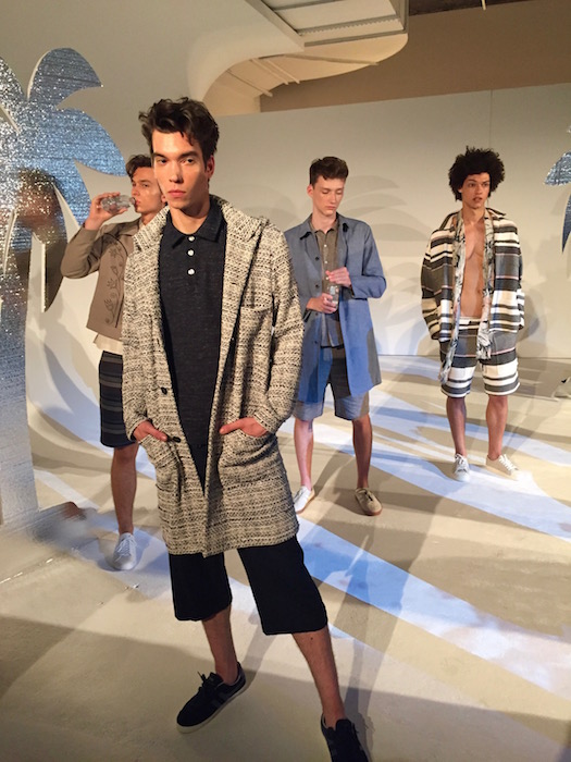 Daniel Hechter Paris came to show in NYC. Earthy neutrals with long overcoats, colorful blazers, and bomber jackets paired well with shorts and trousers. Clean classic looks with fave Roberto Sipos sporting the casual comfortable sleek look of casual for a modern gentleman.