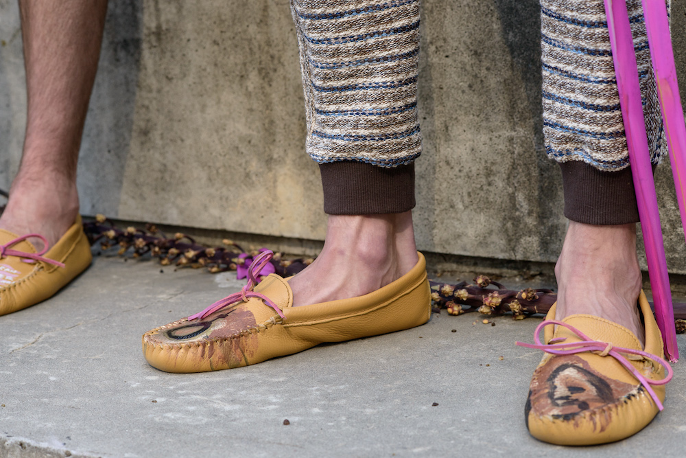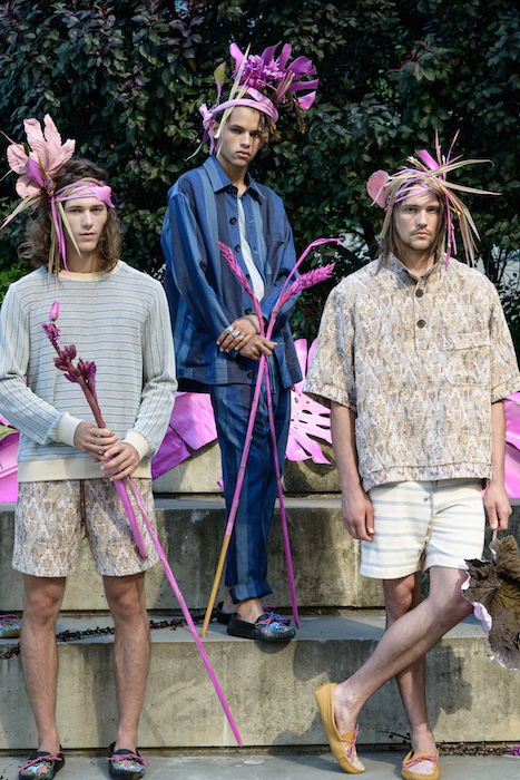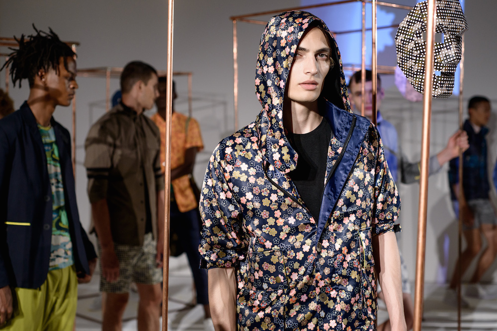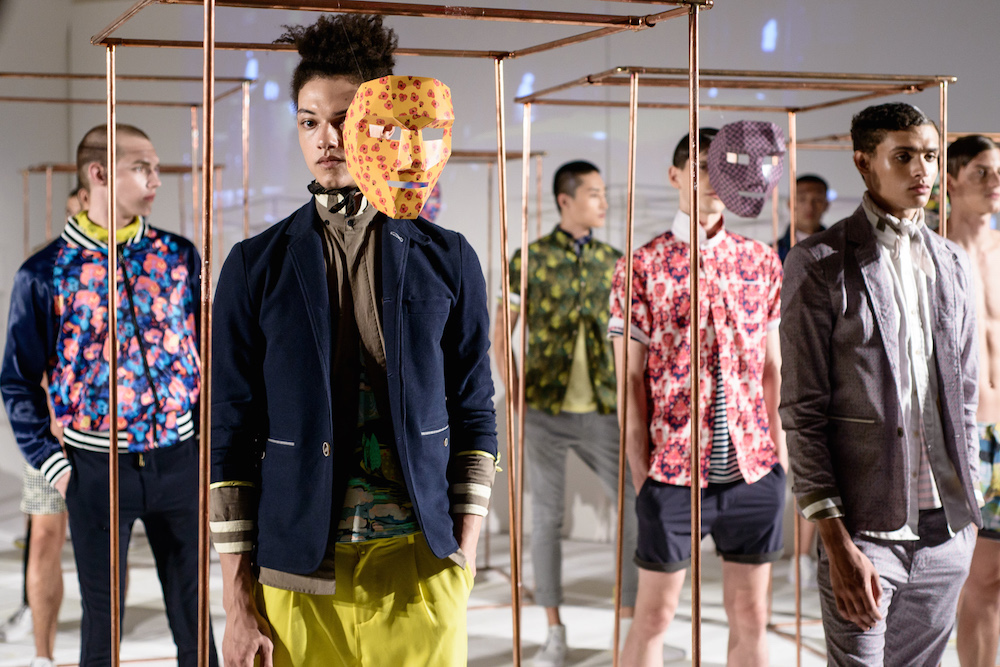 Descendant of Thieves could not have chosen a more fitting name for their menswear brand as they certainly stole the show. This was their first showcase in NYC yet it’s safe to say that they’ve already established their creative and original aesthetic. Aside from the vibrant floral patterns and bold stripes, models were caged by metal frameworks and stood behind dangling masks that obscured their faces, creating this illusion of anonymity. Drawing focus away from the model and onto their outfit, as “thieves” disguised in tribal masks and colorful prints – a hot look for Descendant of Thieves.