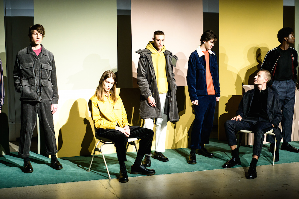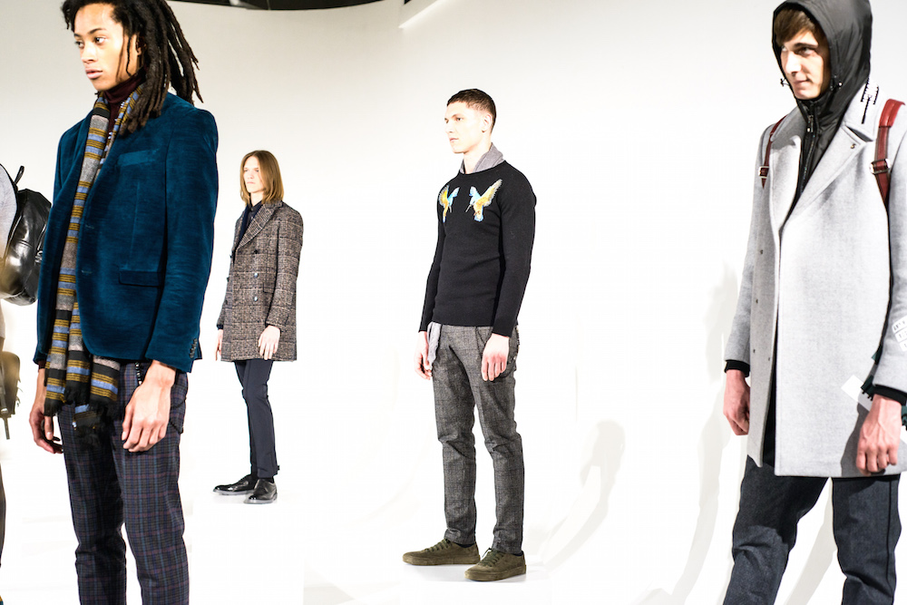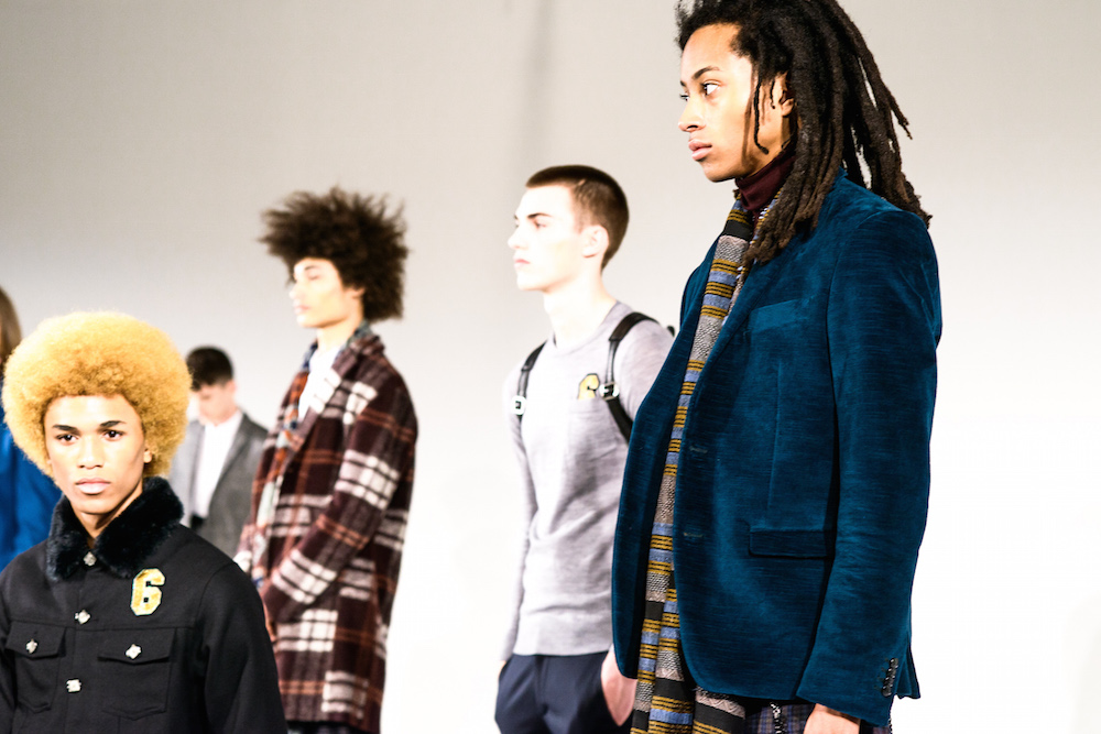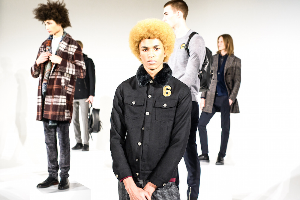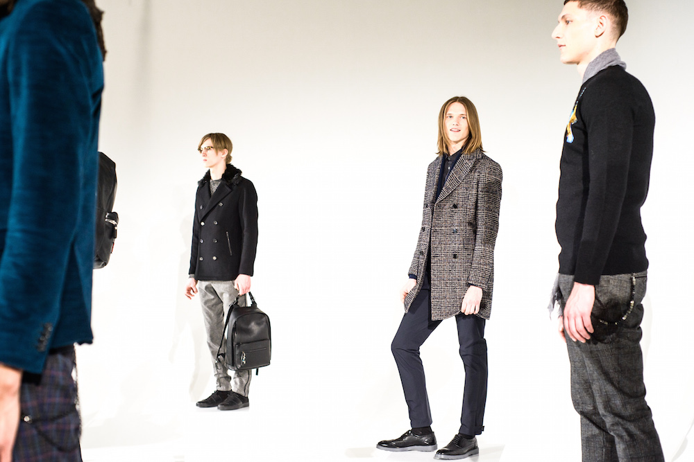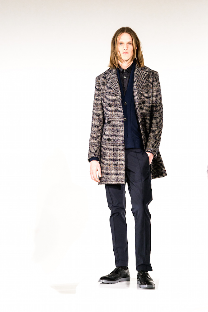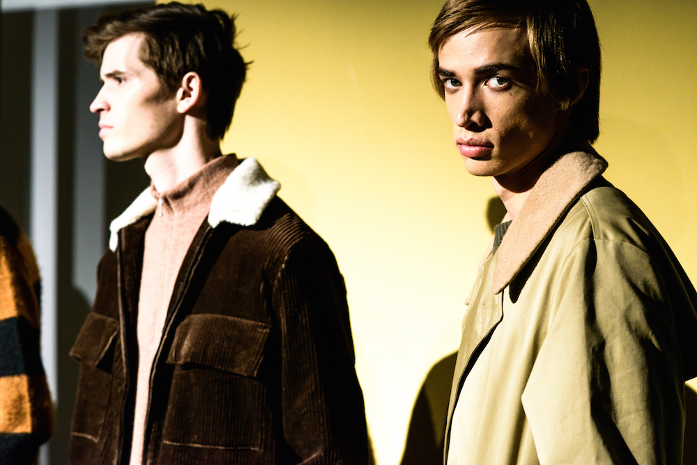 Refined looks were on the spotlight at David Naman’s FW17 collection. Polished looks with pared down sophisticated layering: Turtlenecks, a double-breasted slim jacket, and a velvety cord jacket were standouts in the collection. Lifestyle for the young man, with models Ryan Keating and Michael Lockley sporting the fresh classics.
