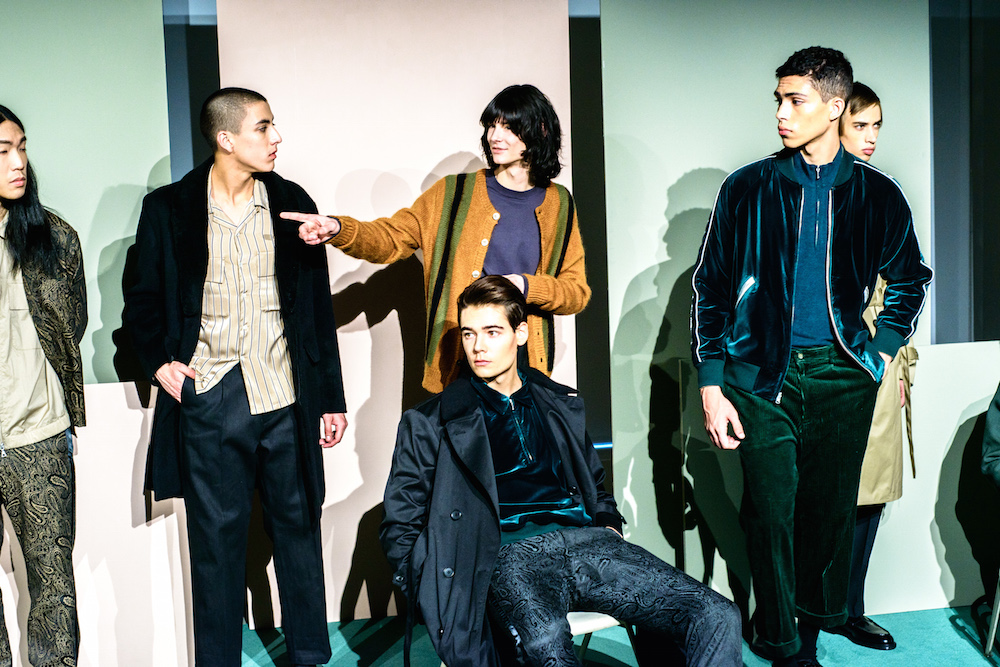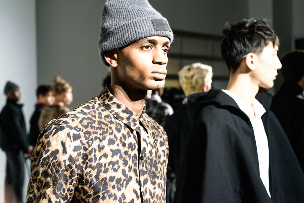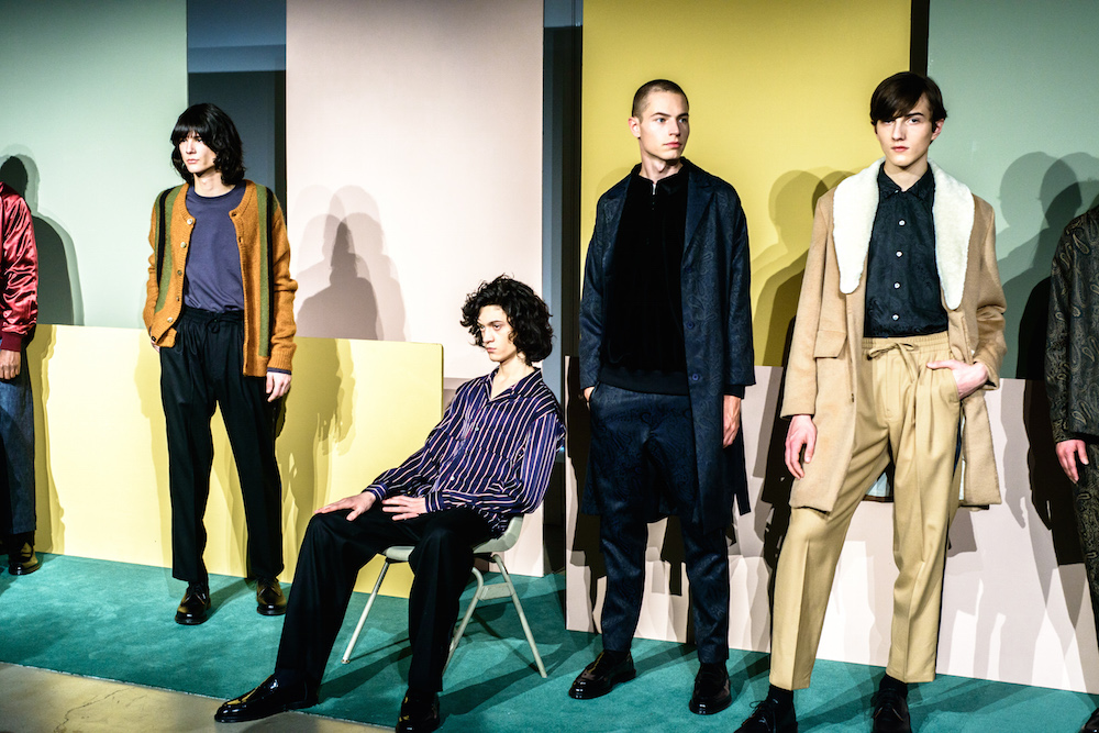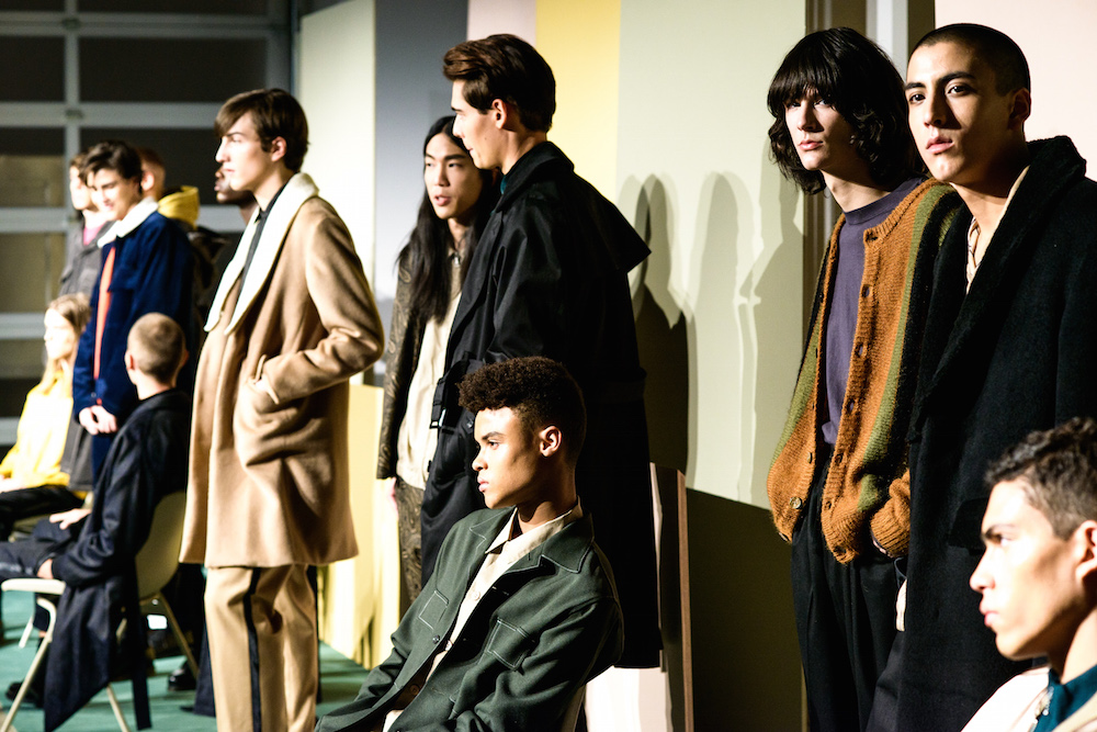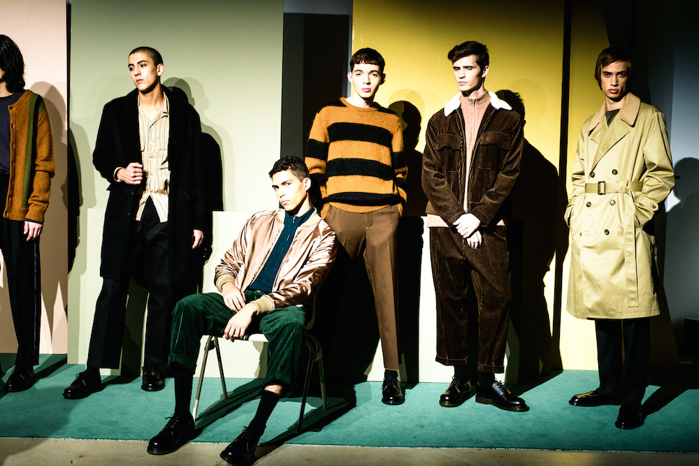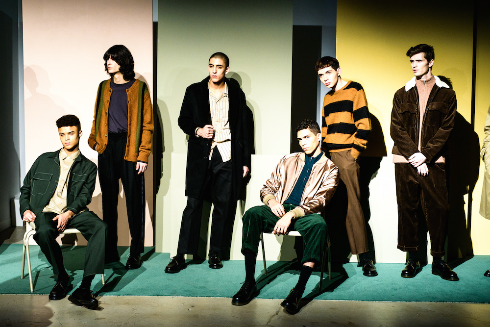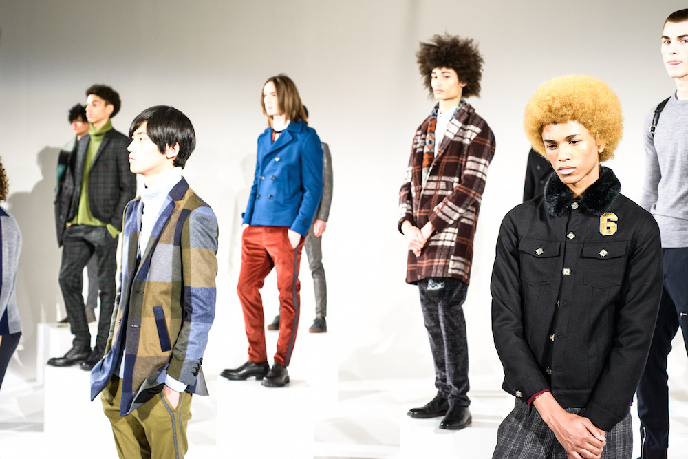 Refined looks were on the spotlight at David Naman’s FW17 collection. Polished looks with pared down sophisticated layering: Turtlenecks, a double-breasted slim jacket, and a velvety cord jacket were standouts in the collection. Lifestyle for the young man, with models Ryan Keating and Michael Lockley sporting the fresh classics.