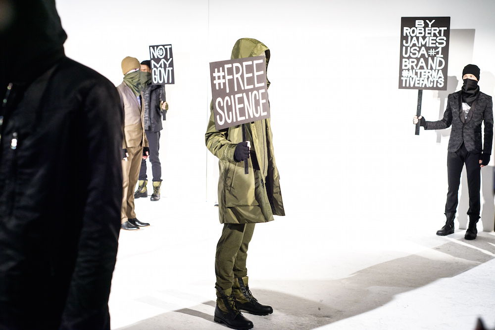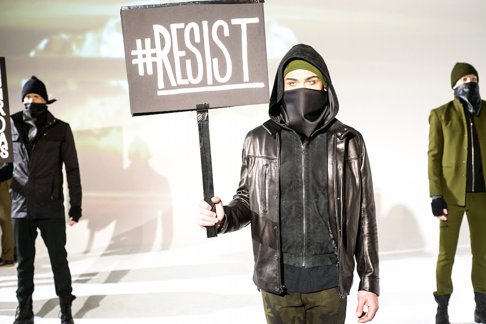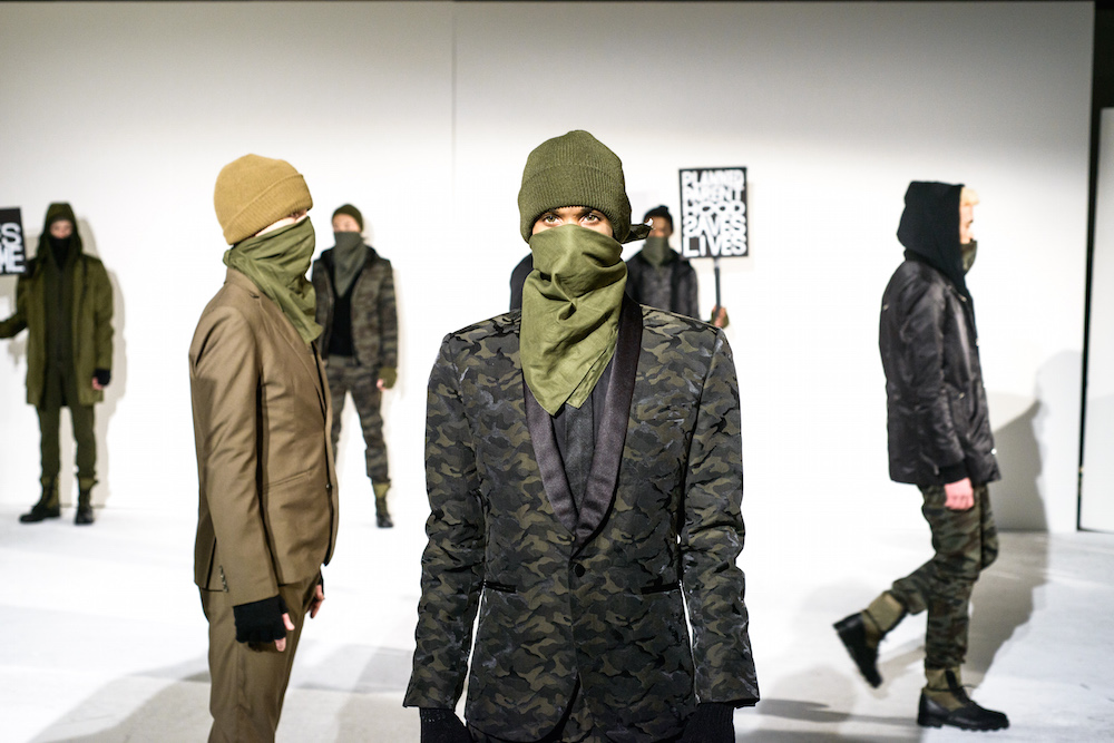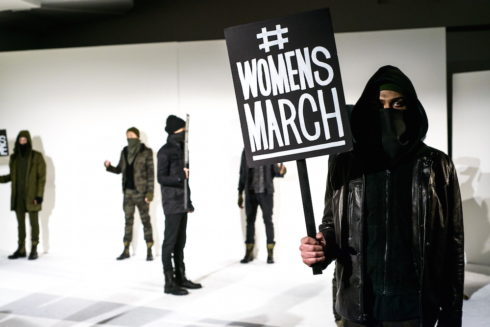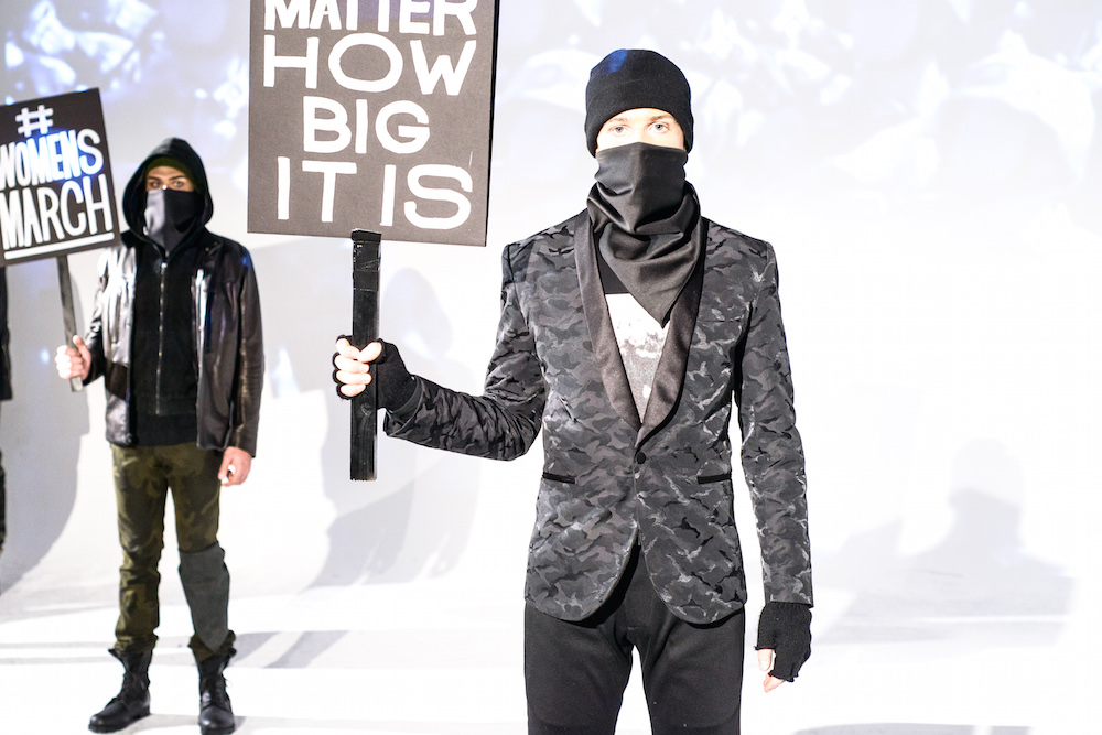 There was definitely something being said at By Robert James FW17 presentation. Inspired by the recent political marches, models sported tailored suits in shades of army green, black and chestnut- each exhibiting a sign with different maxims from the demonstrations. Beanies and face masks were the perfect accessories to complete the message.