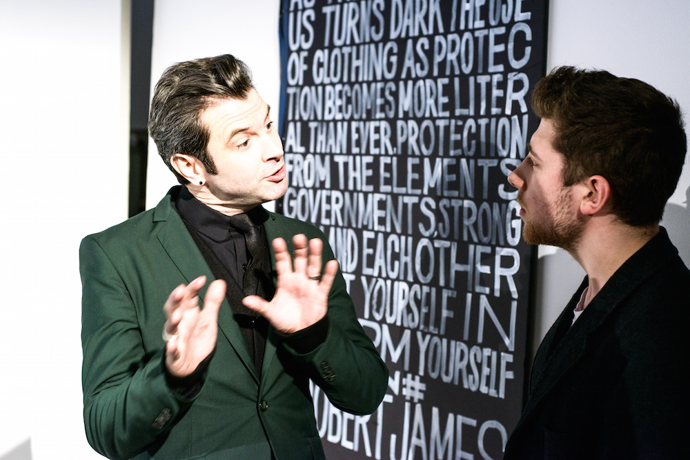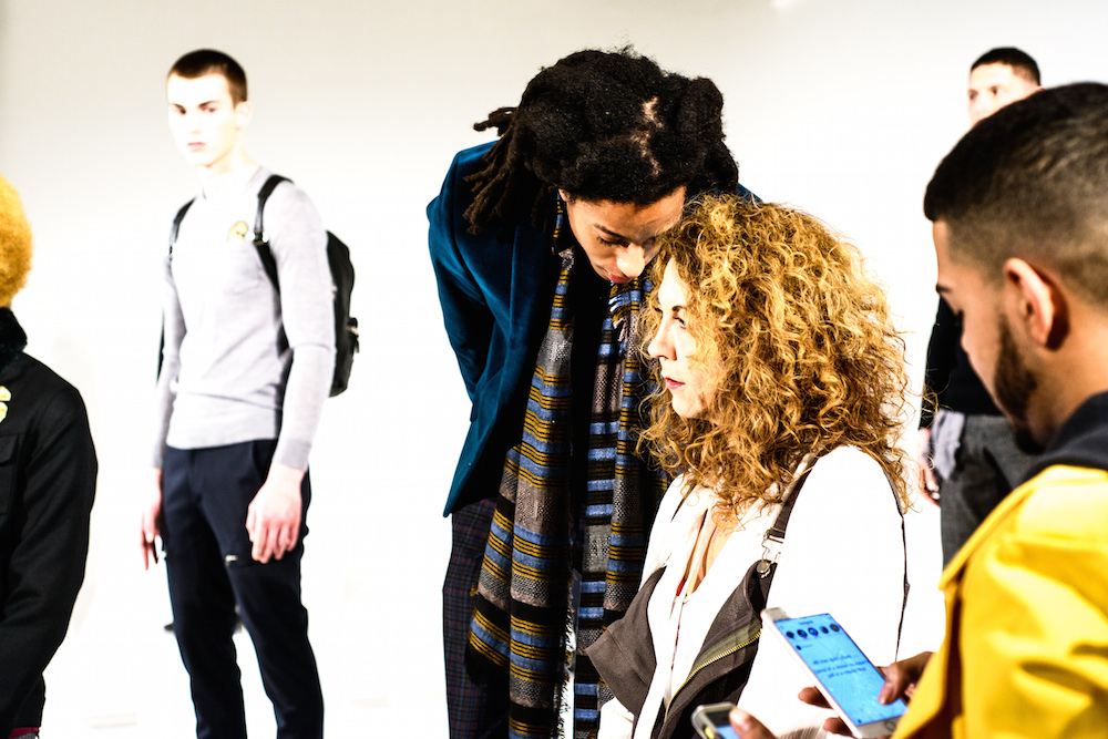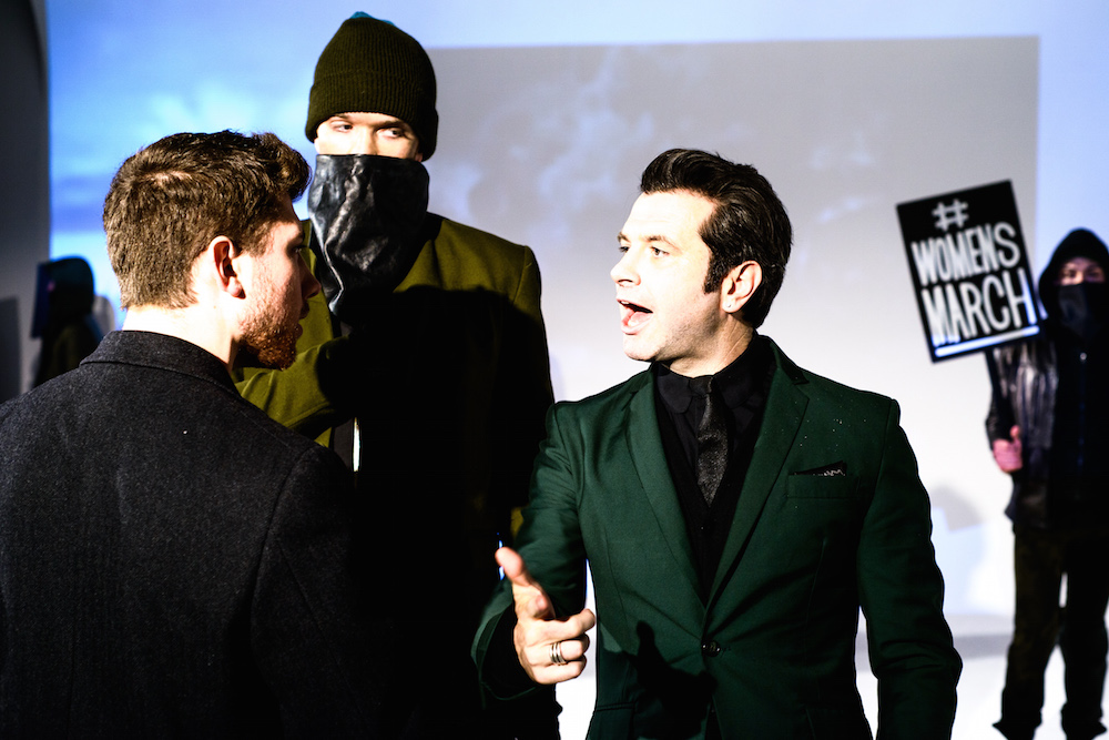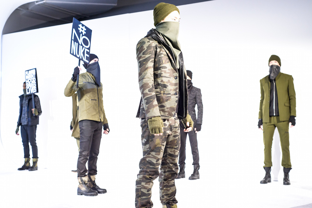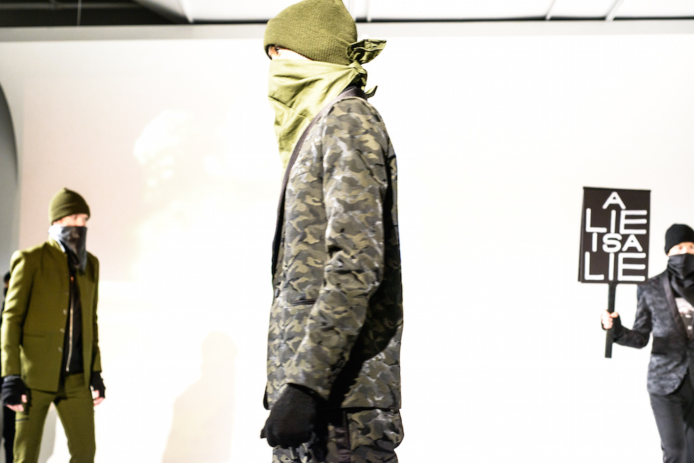 There was definitely something being said at By Robert James FW17 presentation. Inspired by the recent political marches, models sported tailored suits in shades of army green, black and chestnut- each exhibiting a sign with different maxims from the demonstrations. Beanies and face masks were the perfect accessories to complete the message.