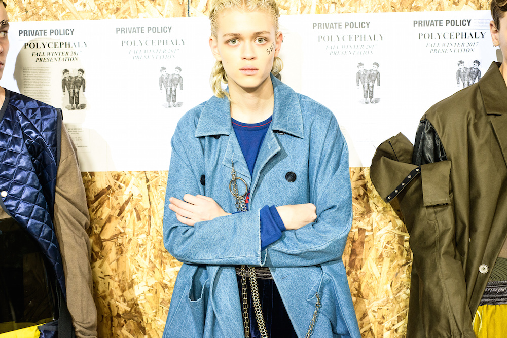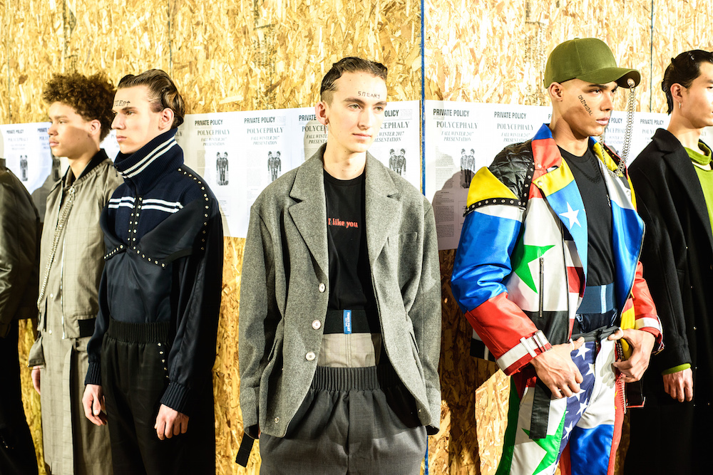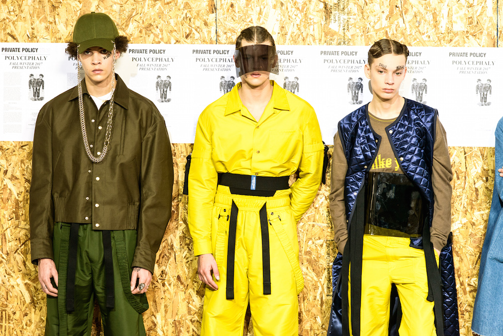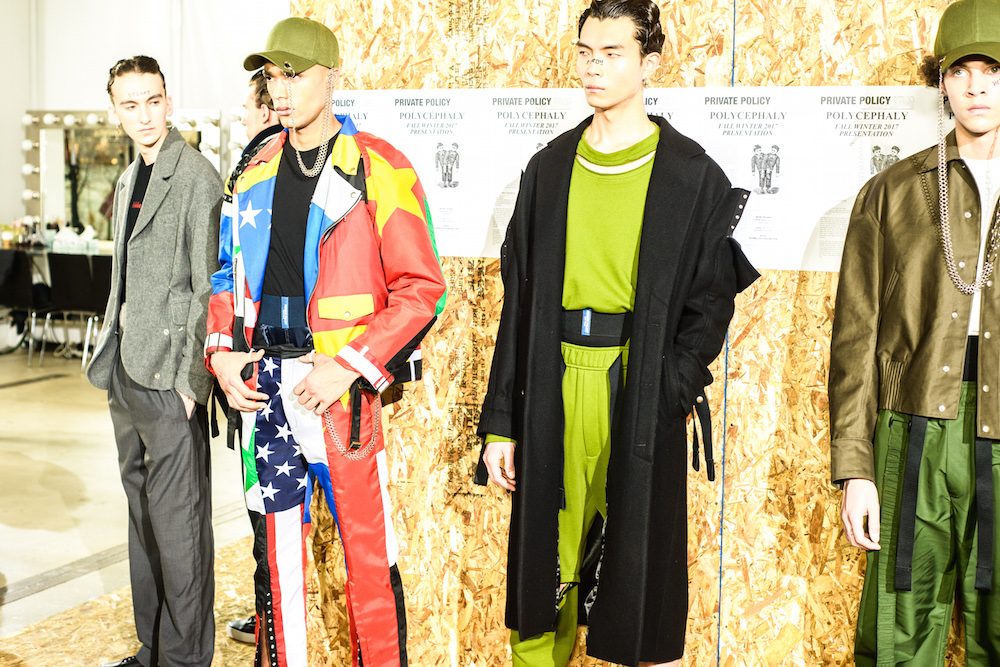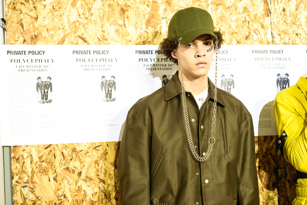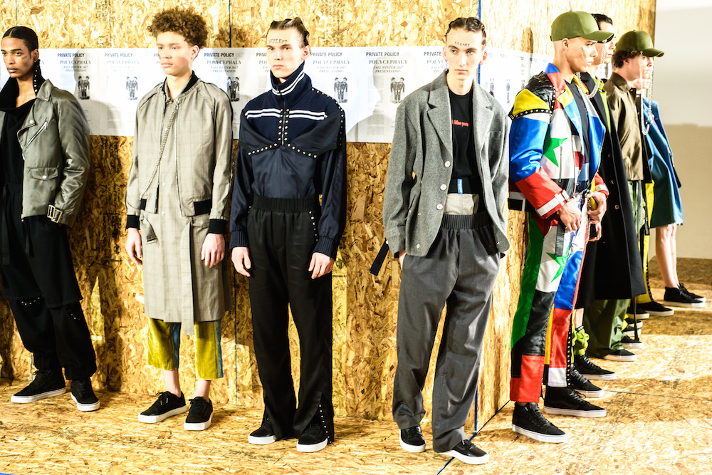 The cool mustard + olive party was through the roof at Private Policy. Each model sporting a tattoo reading referencing “issues” gave an activist edge to the already forward brand. Faves included unravelling (bomber) jackets, utilitarian looks, and an updated suit donning a flag pattern giving a look of unity for FW17. HOT!