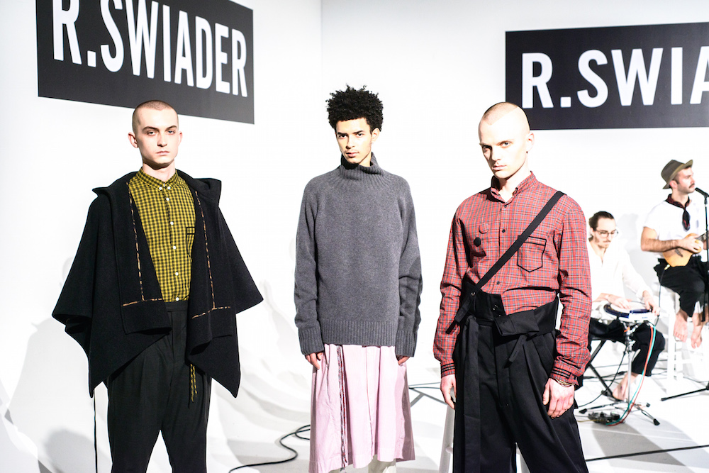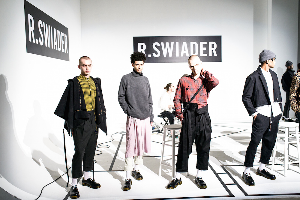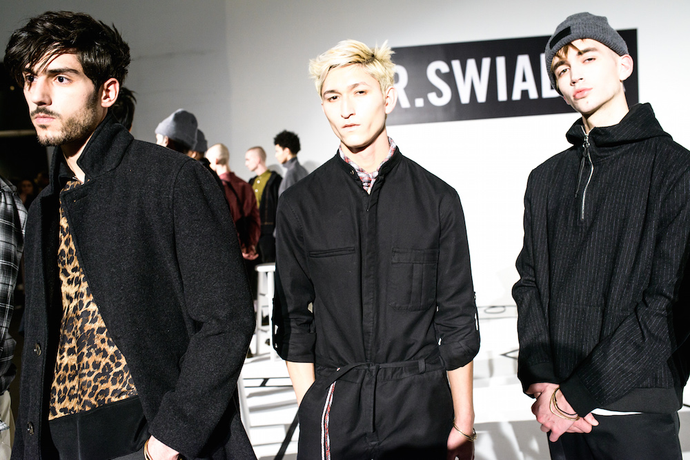 R. Swiader definitely brought the cool boy suave for fall winter, featuring our bearded fave in Phil Sullivan in a grunge-Bklyn layered plaid look. Models were sporting over sized sweaters mixed with belted chinos, polished with jet-black lace ups and the simple silver chains. Grunge away…