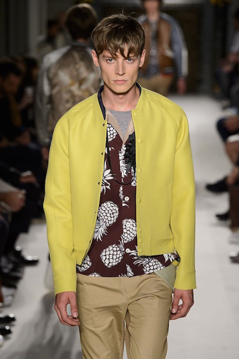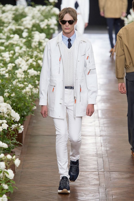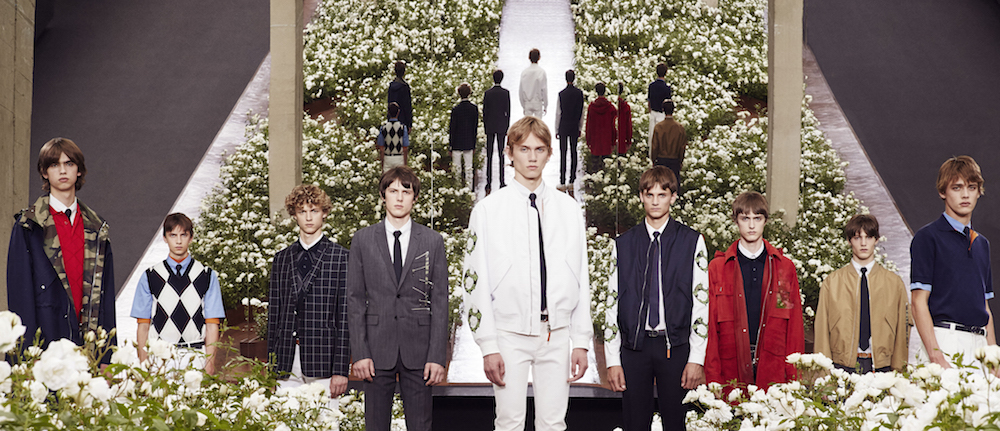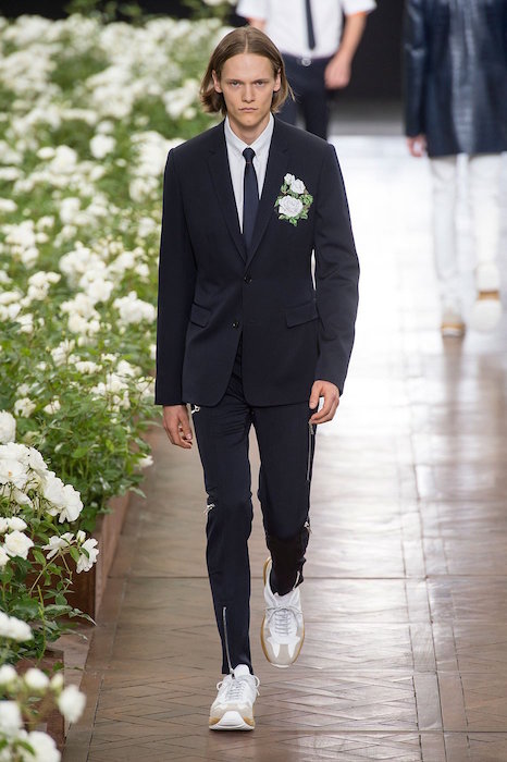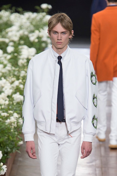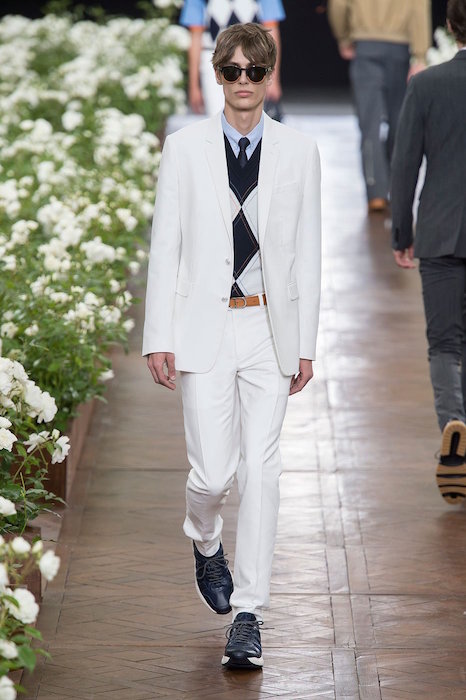 Dior Homme’s runway was filled with bold white flowers in full bloom as the models took down the runway some of the garments were also embroidered with the floral designs. Skinny and slim fit tailored garments were paired with camo and argyle patterns. The collection managed to incorporate bold orange and yellow colors to adding a bit of fun to the beautifully designed new collection.