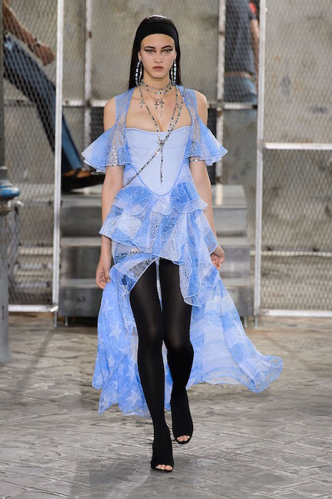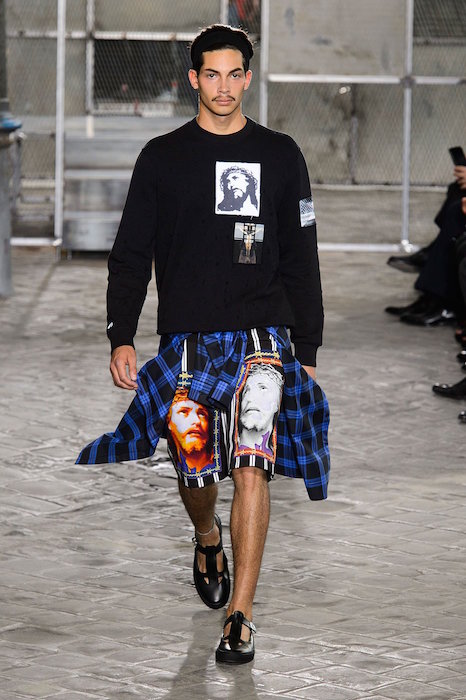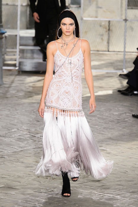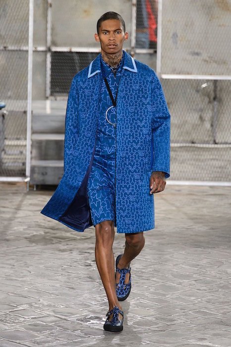 Givenchy presented their latest collection with a combination of male and female models taking command of the runway, with bold black and white pinstripe patterns and religious imagery. Different shades of blue and black showed up repeatedly during the show making the collection more aggressive and dynamic. Both Naomi Campbell and Kendall Jenner made an appearance during the show, drawing viewers further into Givenchy’s new collection.