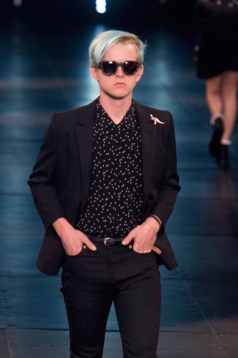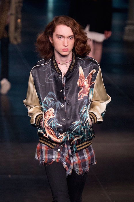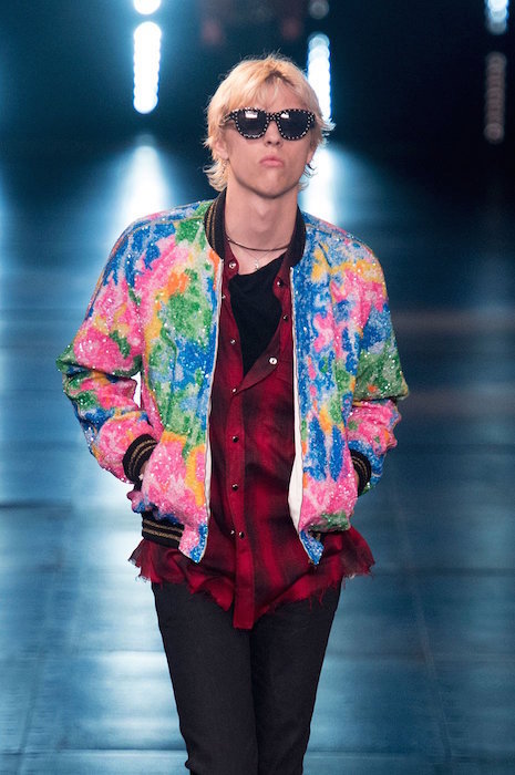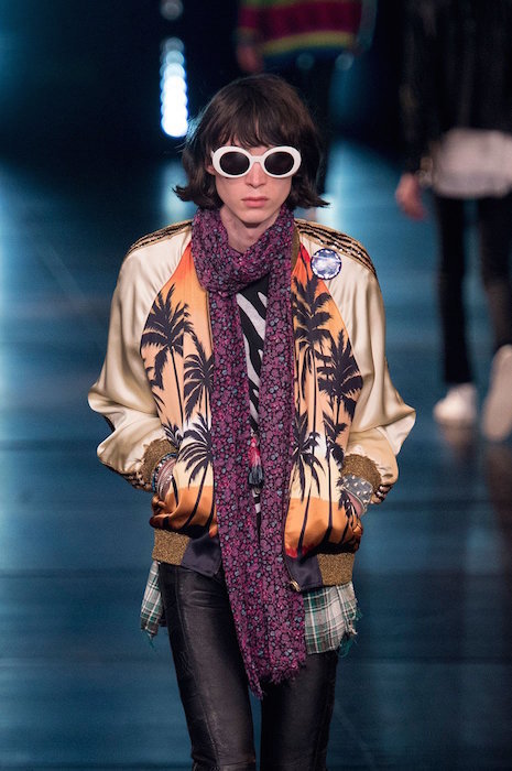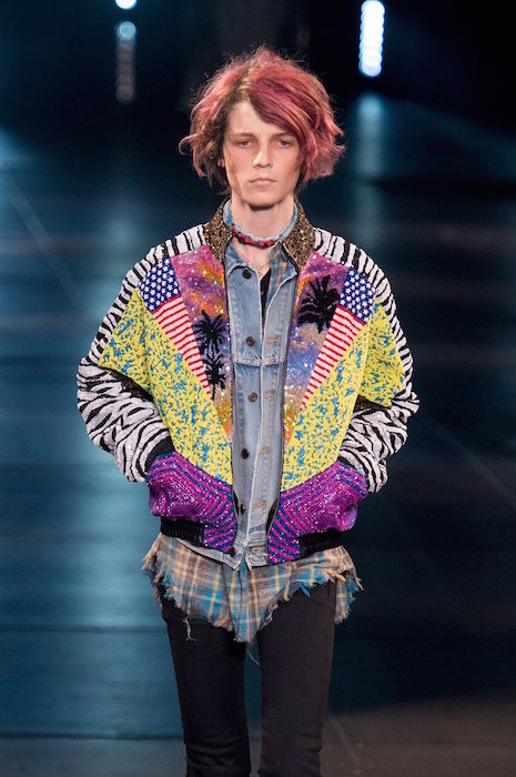 Saint Laurent ss16 menswear brought the shiny embellished house down. Sparkled fringe on guys and girls, with bomber jackets and multi layering with plaids and an attittude for days.