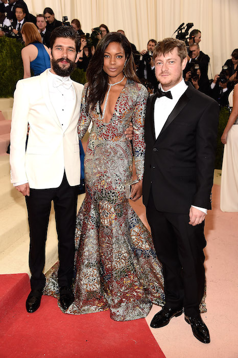 NAOMIE HARRIS wore a metallic jacquard gown with a red, green, blue and yellow floral overprint with a floor sweeping skirt by Burberry.
