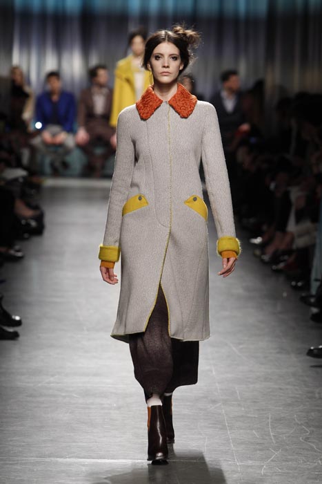 Everyone knows Missoni and knitwear go together. The classic zigzag print and patchwork has been amplified for Fall 2014. Shown during MFW, designer Angela Missoni dressed her girls in menswear staples this time around. The results are still laden with feminine undertones. Colors are 100 percent autumn as gold, orange and brown took center stage like falling leaves. It’s a warm, inviting and all-around cozy chic.