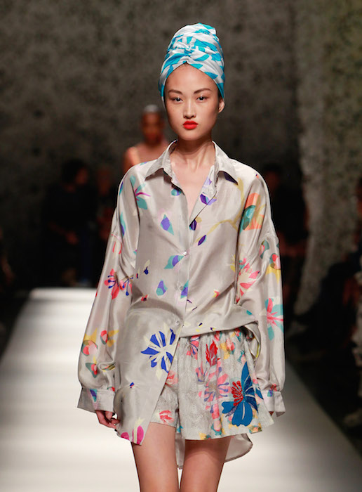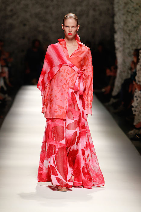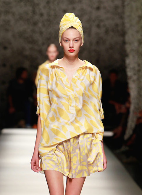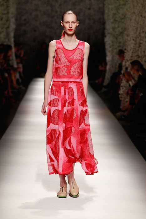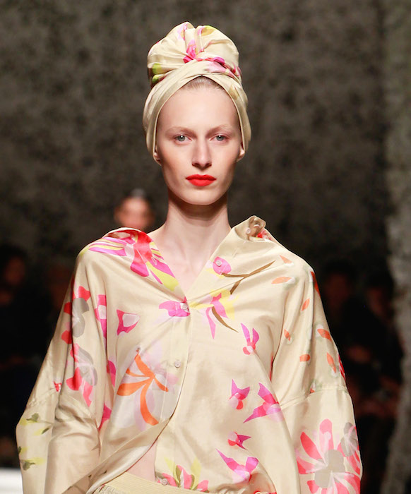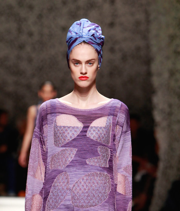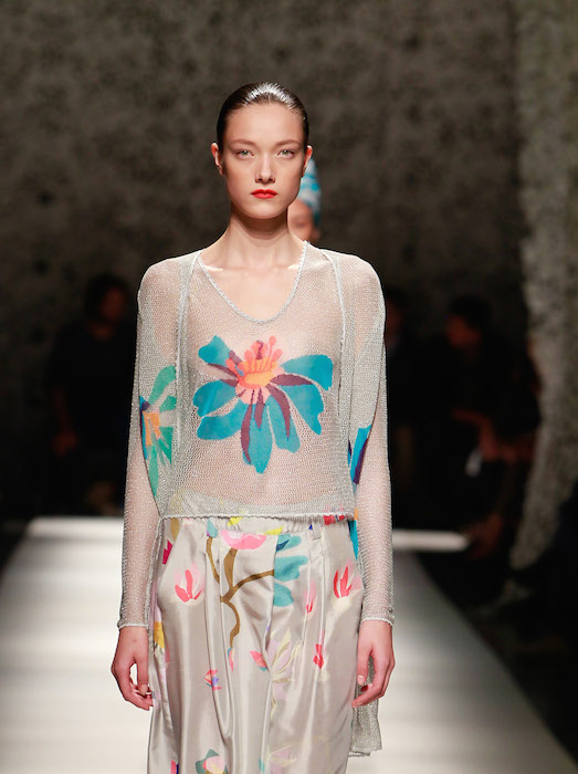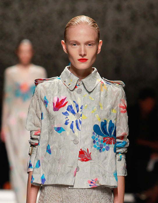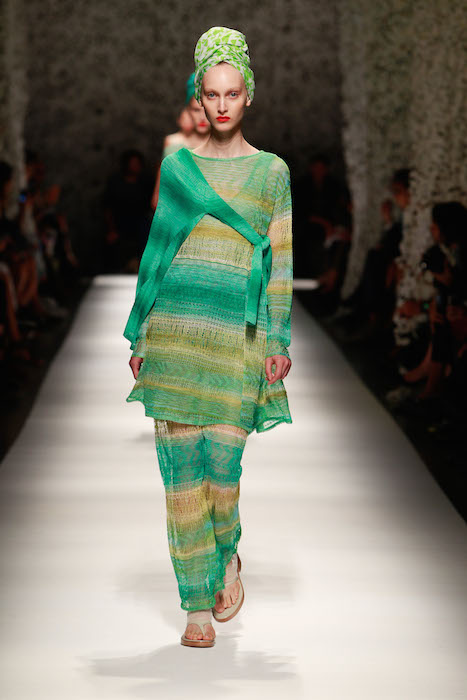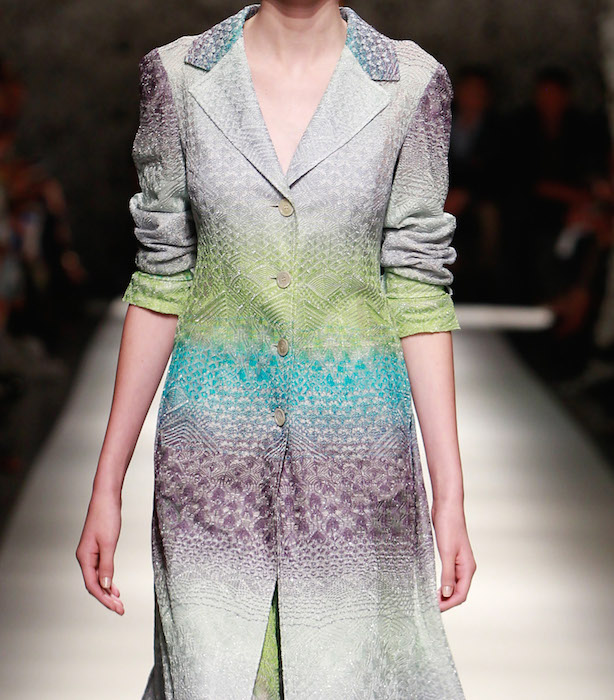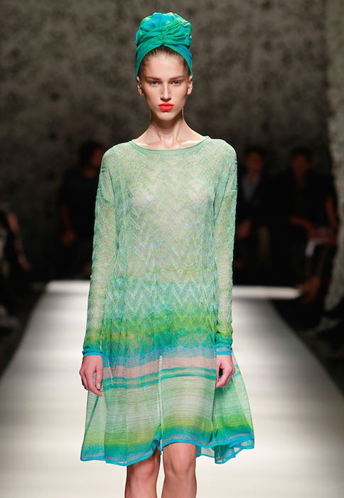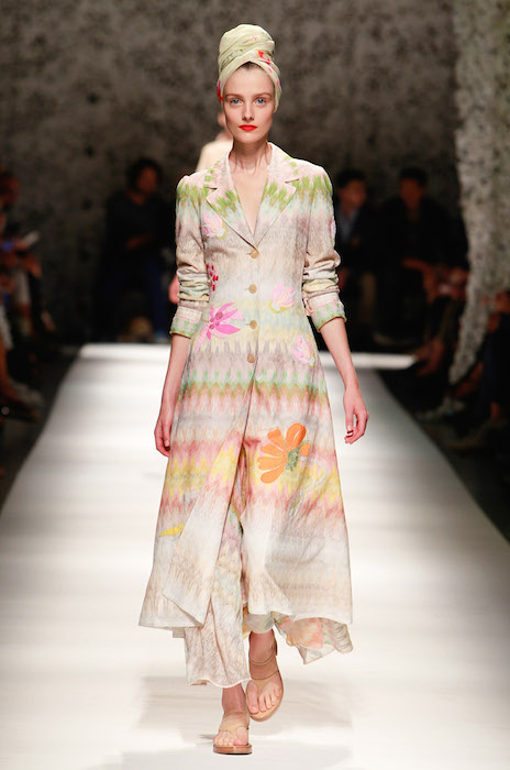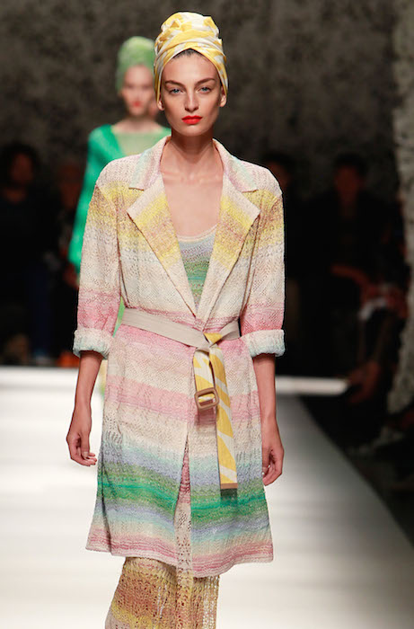 Breezy: Missoni spring 2015 at Milan Fashion Week gives us an airy, featherweight spirit with billowing fluid shapes. Lightweight knits with openwork and intarsia patterns get a touch of embroidery this season. Broad stripes softly blend with floating decoupé petals in matisse- inspired collages and sweet patterns in watercolors on hammered silk.