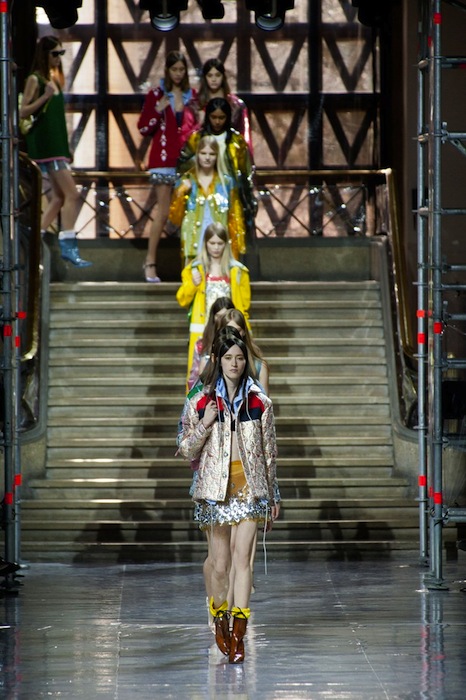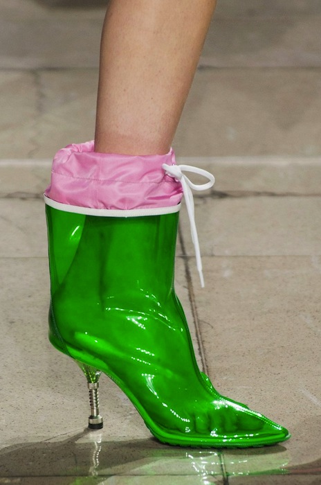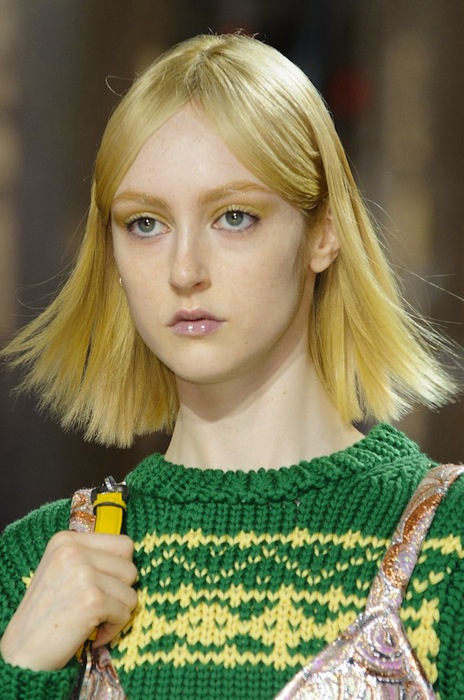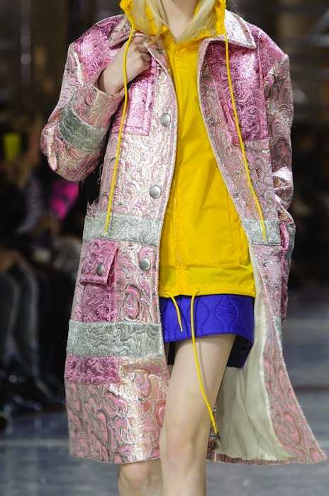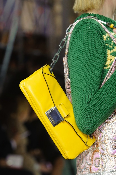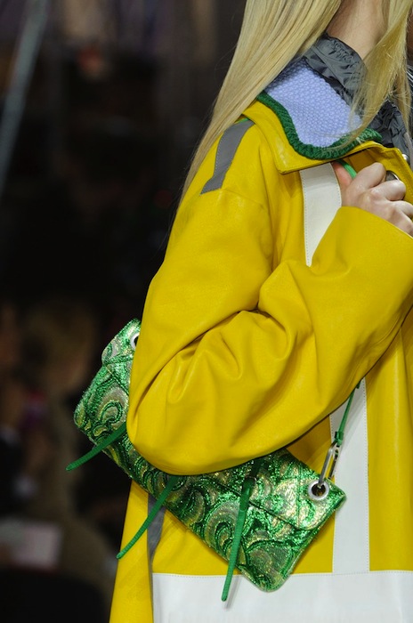 Color pops and raincoats to keep the rain away, the Miu Miu Fall 2014 collection is quite adorable. Shown during PFW, designer Miuccia Prada throws in the girlish charm with leather bad girl chic. Check out our bright and shiny favorite details + accessories.