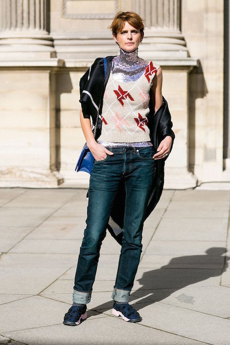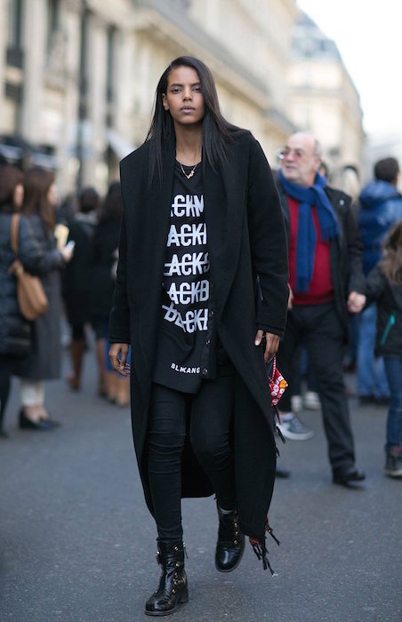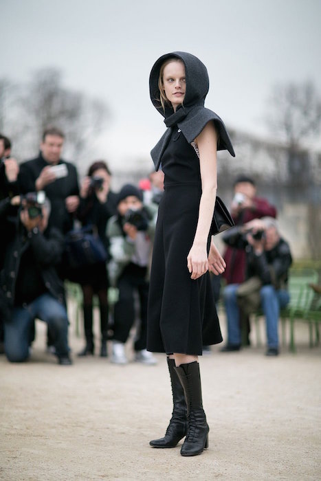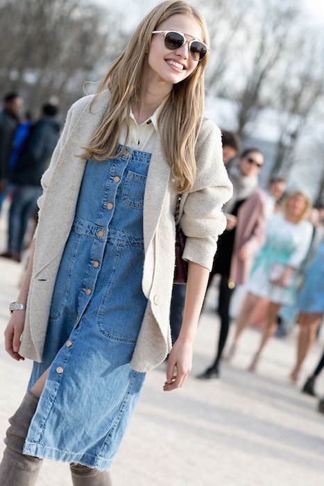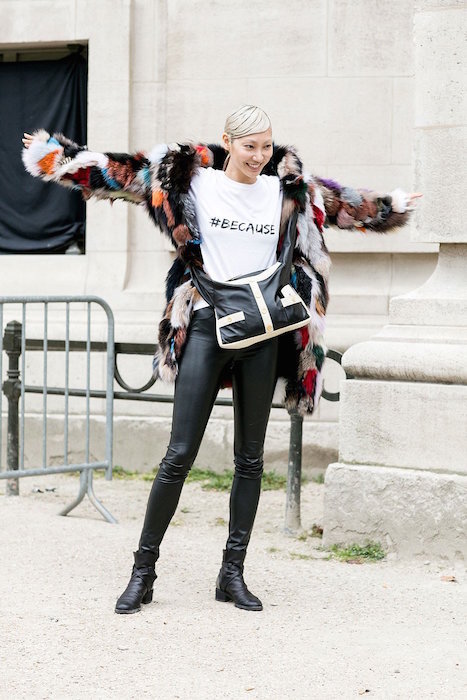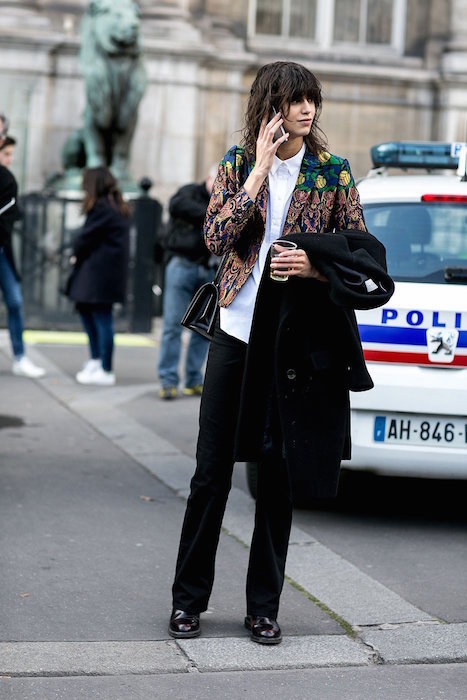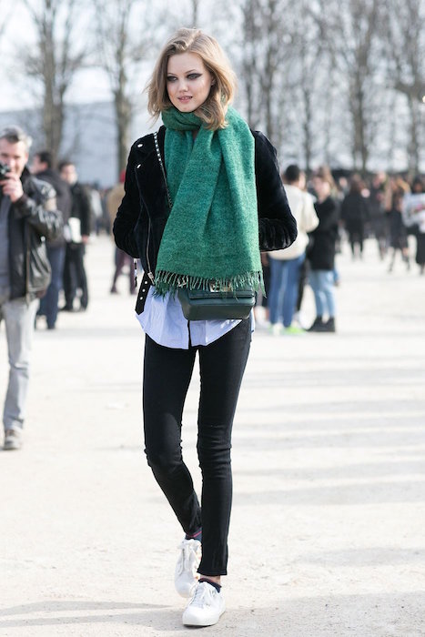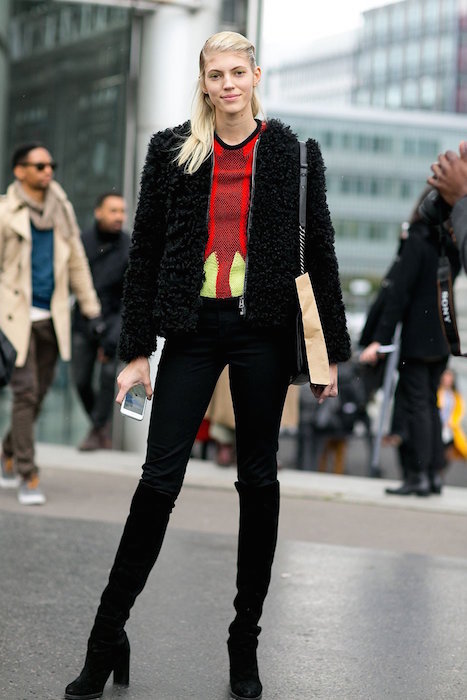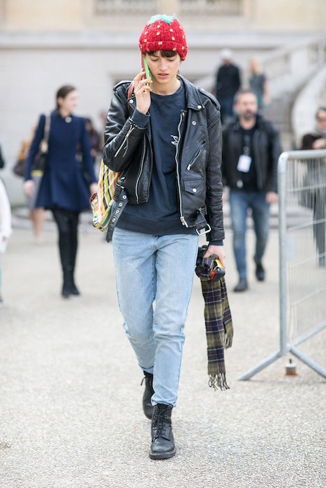 Denim and leather: Taking a quick glimpse back at just a bit over a month ago… Between all the fabulous collections on the Paris fall 2015 catwalk, here’s a look a models going to and from shows, and a few in between. Paris streetsyle at its best… with the girls in what looks like their denim and leather uniform. Black skinnies, vintage-like high waist denim in blue, leather jackets, show bags, and of course, the handheld gadget.