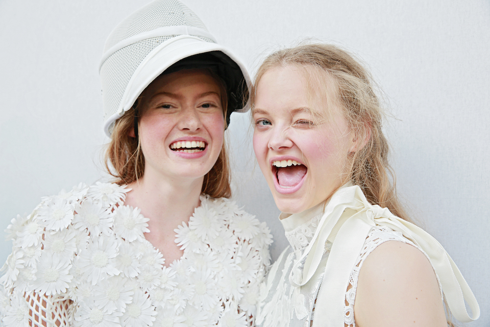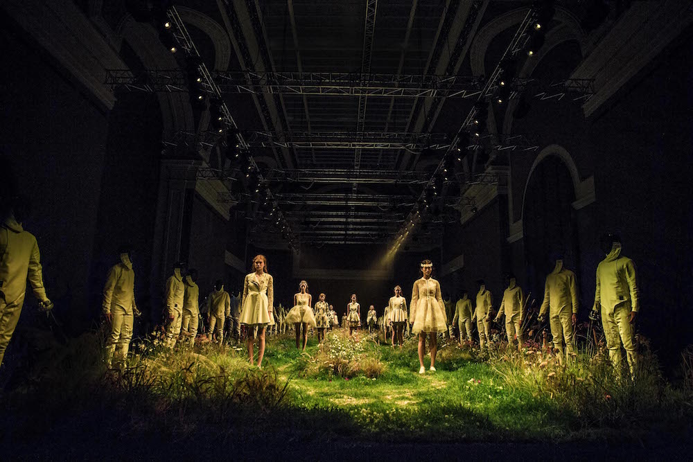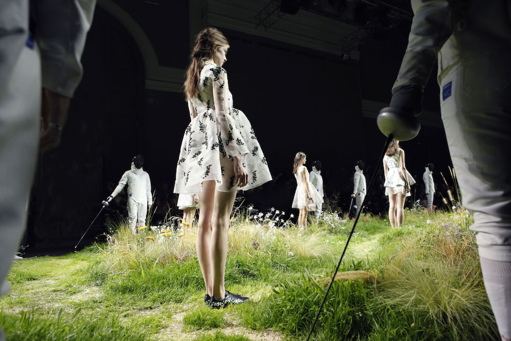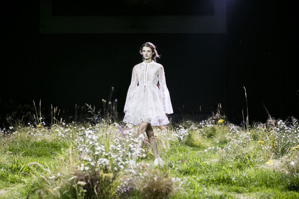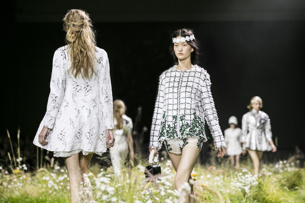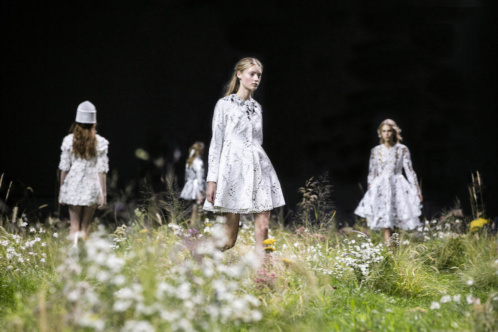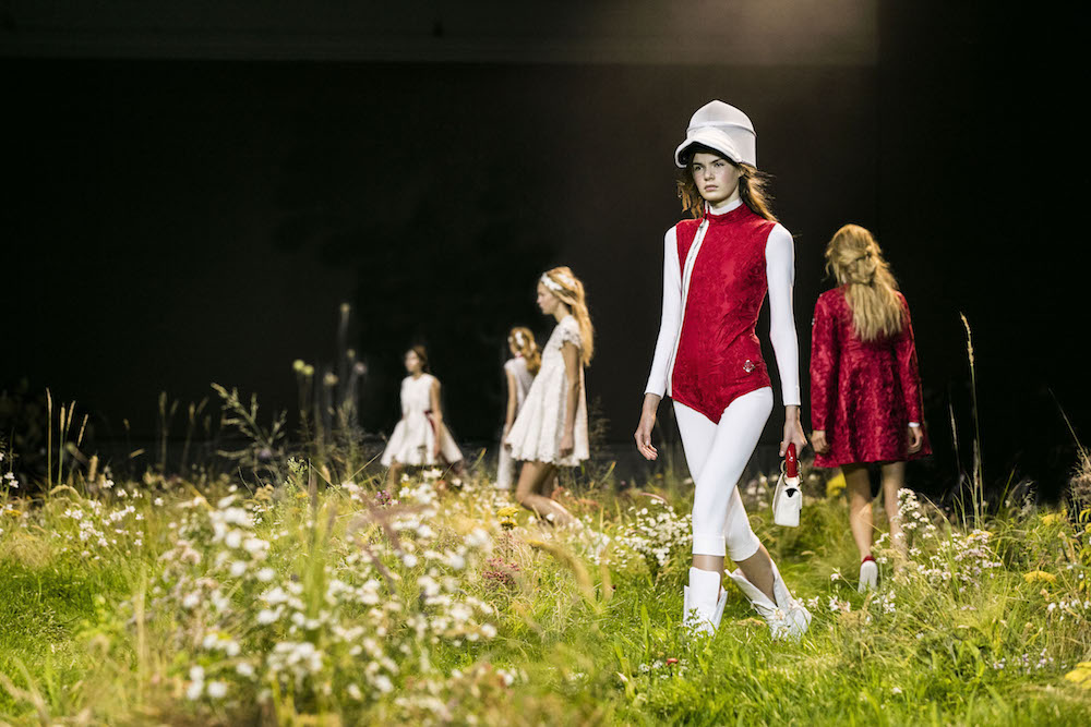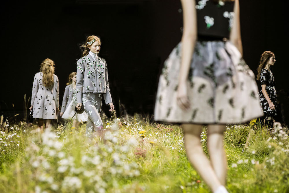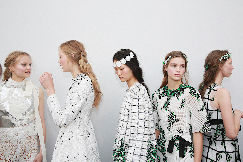 A quick glance BTS backstage and atmosphere at Moncler Gamme Rouge ss16. Giambattista Valli’s charming girl-friendly touch comes in all over patterns in florals, equipped with hair crowns and other floral adornments. The set, with grass and flowers is stunning in iteself. Here’s a sneak peak at what we loved, with more pics and details to come!